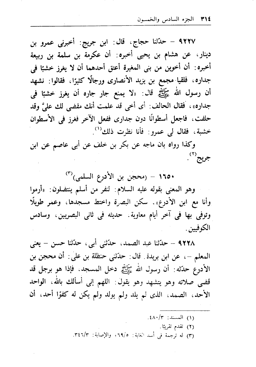 9228 - حدثنا عبد الصمد، حدثني أبي، حدثنا حسن -يعني المعلم-، عن ابن بريدة. قال: حدثني حنظلة بن علي: أن محجن بن الأدرع حدثه: أن رسول الله - صلى الله عليه وسلم - دخل المسجد، فإذا هو برجل قد قضى صلاته وهو يتشهد وهو يقول: اللهم إني أسألك بالله، الواحد الأحد، الصمد، الذي لم يلد ولم يولد ولم يكن له كفواً أحد، أن