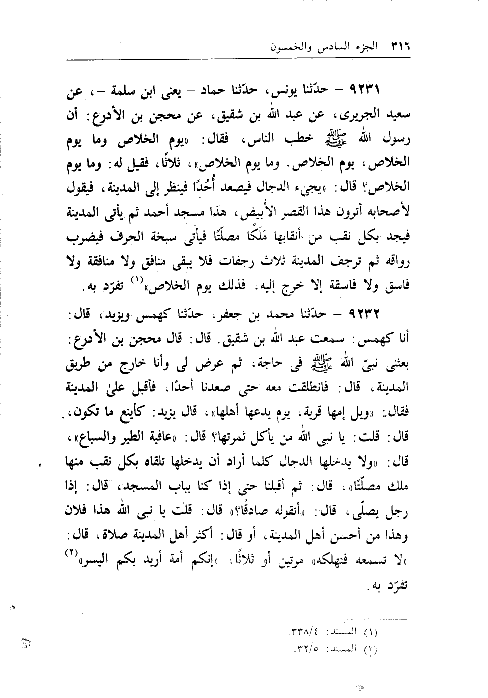 9232 - حدثنا محمد بن جعفر، حدثنا كهمس ويزيد، قال: أنا كهمس: سمعت عبد الله بن شقيق. قال: قال محجن بن الأدرع: بعثني نبي الله - صلى الله عليه وسلم - في حاجة، ثم عرض لي وانا خارج من طريق المدينة، قال: فانطلقت معه حتى صعدنا أحداً، فأقبل على المدينة فقال: ((ويل إمها قرية، يوم يدعها أهلها)) ، قال يزيد: كأينع ماتكون، قال: قلت: يانبي الله من يأكل ثمرتها؟ قال: ((عافية الطير والسباع)) ، قال: ((ولايدخلها الدجال كلما أراد أن يدخلها تلقاه بكل نقب منها ملك مصلتاً)) ، قال: ثم أقبلنا حتى إذا كنا بباب المسجد، قال: إذا رجل يصلي، قال: ((أتقوله صادقاً؟)) قال: قلت يانبي الله هذا فلان وهذا من أحسن أهل المدينة، أو قال: أكثر أهل المدينة صلاة، قال: ((لاتسمعه فتهلكه)) مرتين أو ثلاثاً، ((إنكم أمة أريد بكم اليسر)) (¬2) . تفرد به.