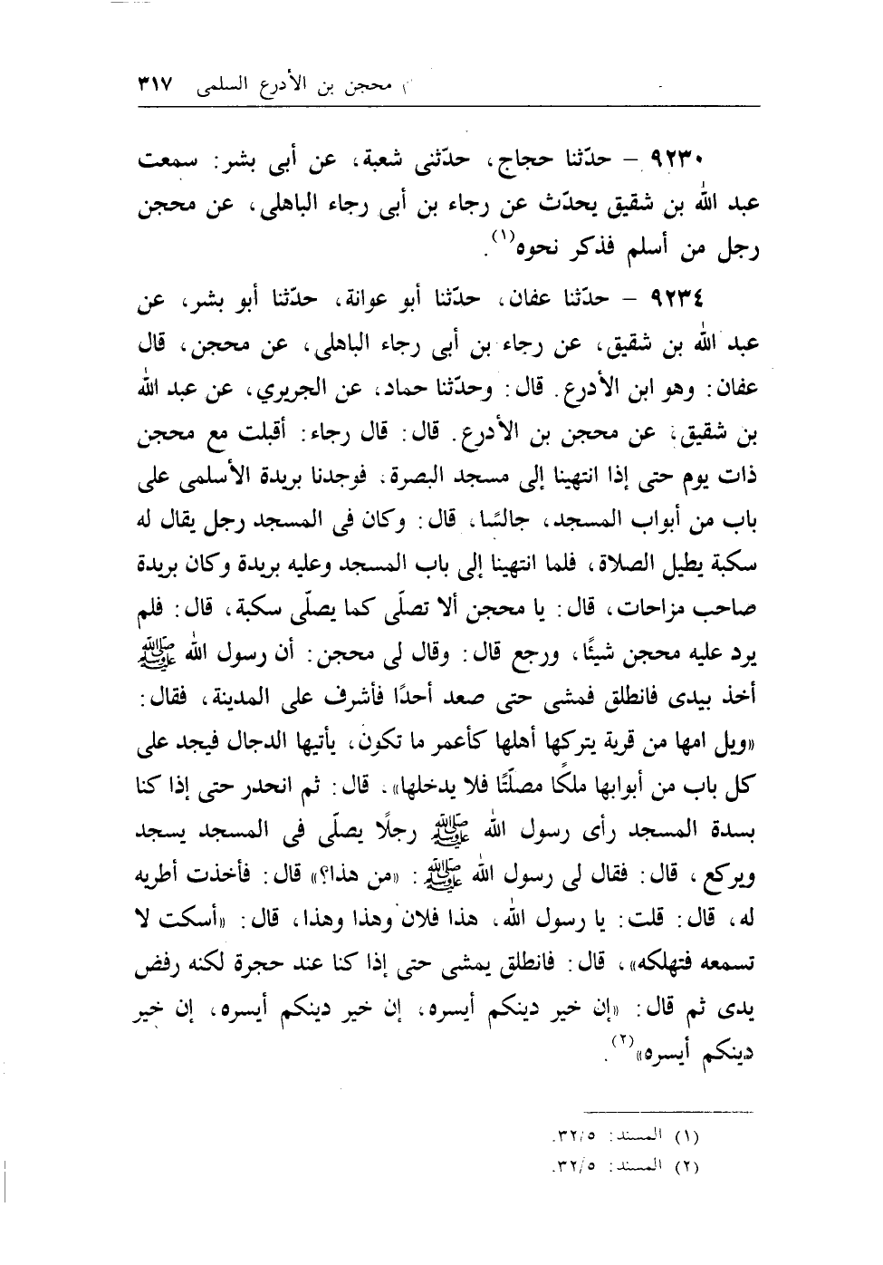 حدثنا حجاج، حدثني شعبة، عن أبي بشر: عن عبد الله بن شقيق، عن رجاء بن أبي رجاء الباهلي، عن محجن، قال عفان: وهو ابن الأدرع. قال: وحدثنا حماد، عن الجريري، عن عبد الله بن شقيق، عن محجن بن الأدرع، قال رجاء: أقبلت مع محجن ذات يوم حتى إذا انتهينا إلى مسجد البصرة، فوجدنا بريدة الأسلمي على باب من أبواب المسجد، جالساً، قال: وكان في المسجد رجل يقال له سكبة يطيل الصلاة، فلما انتهينا إلى باب المسجد وعليه بريدة وكان بريدة صاحب مزاحات، قال: يامحجن ألا تصلي كما يصلي سكبة، قال: فلم يرد عليه محجن شيئاً، ورجع قال: وقال لي محجن: أن رسول الله - صلى الله عليه وسلم - أخذ بيدي فانطلق فمشي حتى صعد أحداً فأشرف على المدينة، فقال: ((ويل امها من قرية يتركها أهلها كأعمر ماتكون، يأتيها الدجال فيجد على كل باب من أبوابها ملكاً مصلتاً فلايدخلها)) ، قال: ثم انحدر حتى إذا كنا بسدة المسجد رأى رسول الله - صلى الله عليه وسلم - رجلاً يصلي في المسجد يسجد ويركع، قال: فقال لي رسول الله - صلى الله عليه وسلم -: ((من هذا؟)) قال: فأخذت أطريه له، قال: قلت: يارسول الله، هذا فلان وهذا وهذا، قال: ((أسكت لاتسمعه فتهلكه)) ، قال: فانطلق يمشي حتى إذا كنا عند حجرة لكنه رفض يدي ثم قال: ((إن خير دينكم أيسره، إن خير دينكم أيسره، إن خير دينكم أيسره)) (¬2) .