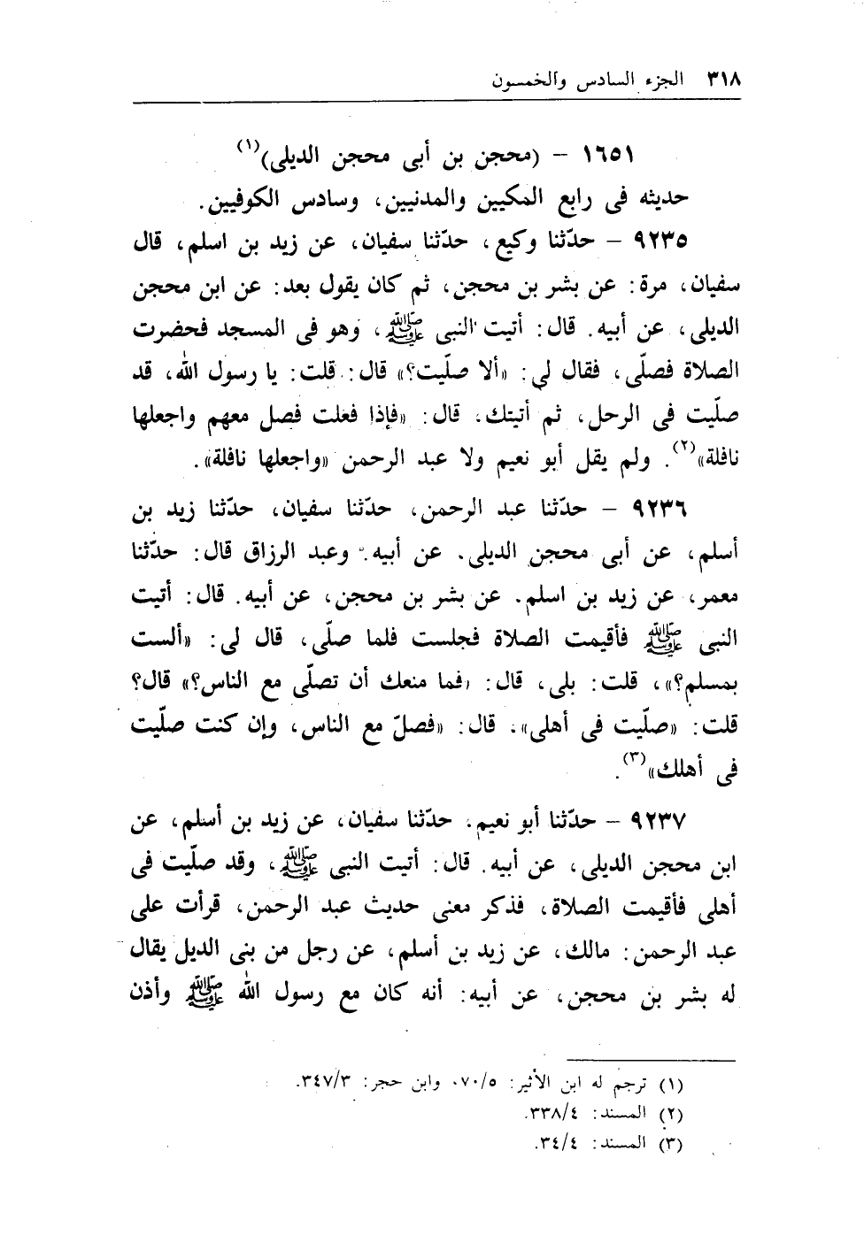 9236 - حدثنا عبد الرحمن، حدثنا سفيان، حدثنا زيد بن أسلم، عن أبي محجن الديلي، عن أبيه، وعبد الرزاق قال: حدثنا معمر، عن زيد بن أسلم، عن بشر بن محجن، عن أبيه، قال: أتيت النبي - صلى الله عليه وسلم - فأقيمت الصلاة فجلست فلما صلى، قال لي: ((ألست بمسلم؟)) ، قلت: بلى، قال: ((فما منعك أن تصلي مع الناس؟)) قال: قلت: ((صليت في أهلي)) ، قال: ((فصل مع الناس، وإن كنت صليت في أهلك)) (¬3) .