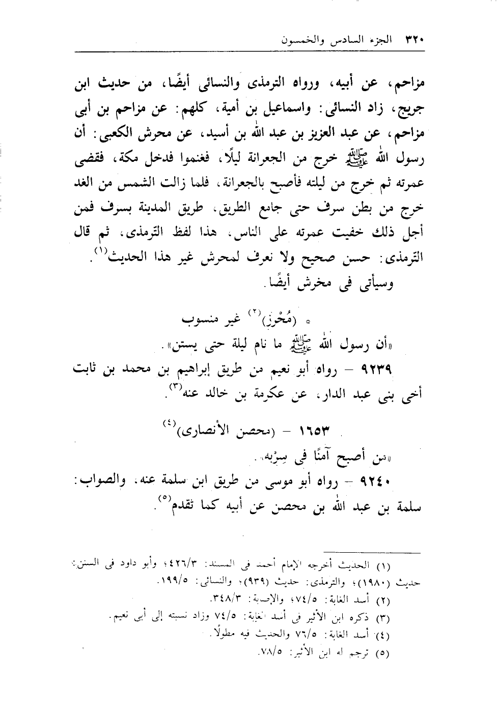 مزاحم، عن أبيه، ورواه الترمذي والنسائي أيضاً، من حديث ابن جريج، زاد النسائي: وإسماعيل ابن أمية، كلهم: عن مزاحم بن ابي مزاحم، عن عبد العزيز بن عبد الله بن أسيد، عن محرش الكعبي: أن رسول الله - صلى الله عليه وسلم - خرج من الجعرانة ليلاً، فغنموا فدخل مكة، فقضى عمرته ثم خرج من ليلته فأصبح بالجعرانة، فلما زالت الشمس من الغد خرج من بطن سرف حتى جامع الطريق، طريق المدينة بسرف فمن أجل ذلك خفيت عمرته على الناس، هذا لفظ الترمذي، ثم قال الترمذي: حسن صحيح ولانعرف لمحرش غير هذا الحديث (¬1) .
