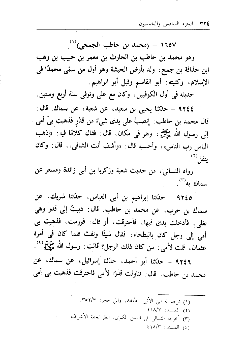 9246 - حدثنا ابو أحمد، حدثنا إسرائيلن عن سماك، عن محمد بن حاطب، قال: تناولت قدراً لأمي فاحترقت فذهبت بي أمي