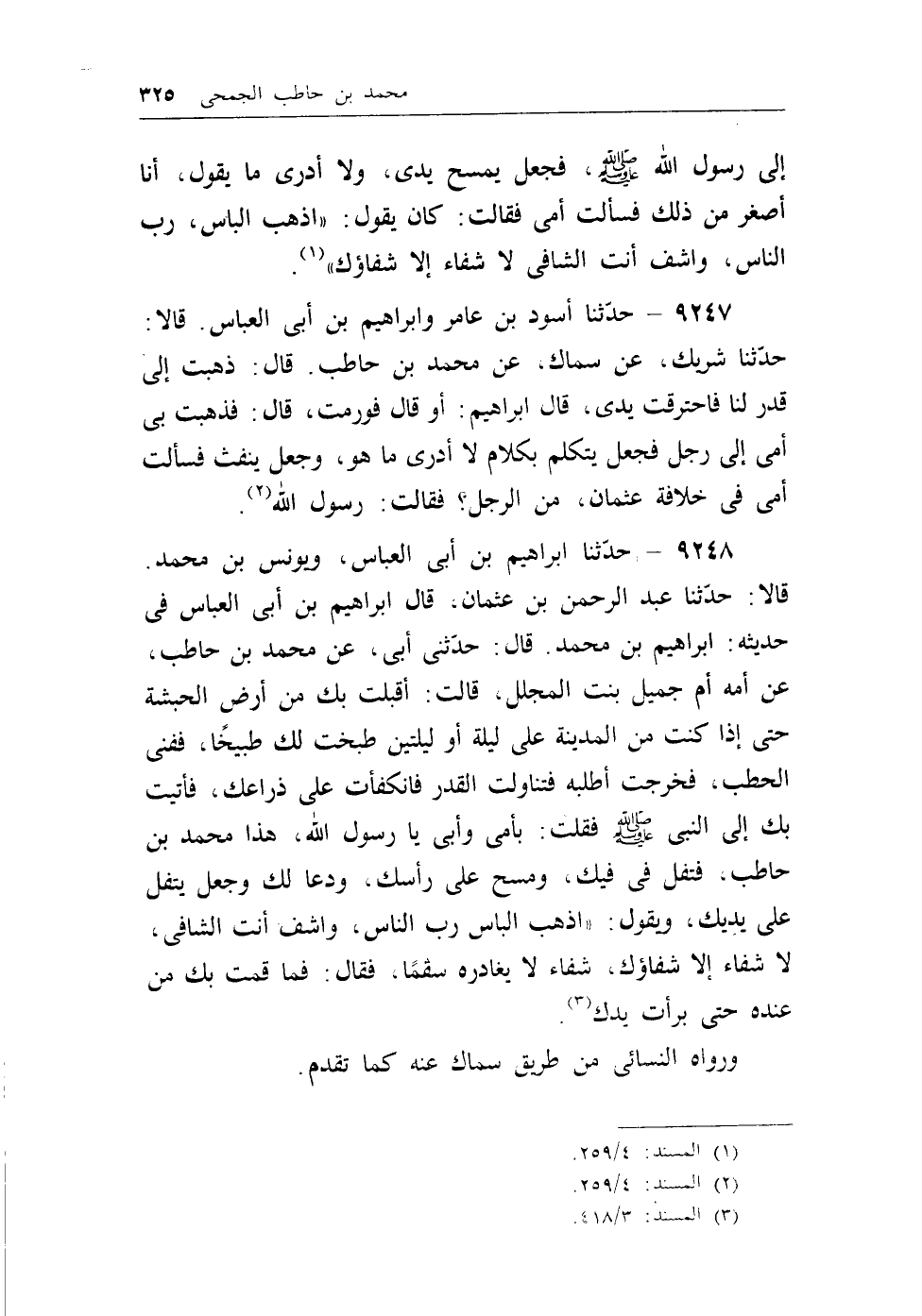 9248 - حدثنا إبراهيم بن أبي العباس، ويونس بن محمد. قالا: حدثنا عبد الرحمن بن عثمان، قال إبراهيم بن أبي العباس في حديثه: إبراهيم بن محمد. قال: حدثني أبي، عن محمد بن حاطب، عن أمه أم جميل بنت المجلل، قالت: أقبلت بك من أرض الحبشة حتى إذا كنت من المدينة على ليلى أو ليلتين طبخت لك طبيخاً، ففنى الحطب، فخرجت أطلبه فتناولت القدر فانكفأت على ذراعك، فأتيت بك إلى النبي - صلى الله عليه وسلم - فقلت: بأمي وأبي يارسول الله، هذا محمد بن حاطب، فتفل في فيك، ومسح على رأسك، ودعا لك وجعل يتفلعلى يديك، ويقول: ((اذهب الباس رب الناس، واشف أنت الشافي، لاشفاء إلا شفاؤك، شفاء لايغادره سقماً، فقال: فما قمت بك من عنده حتى برأت يدك (¬2) .