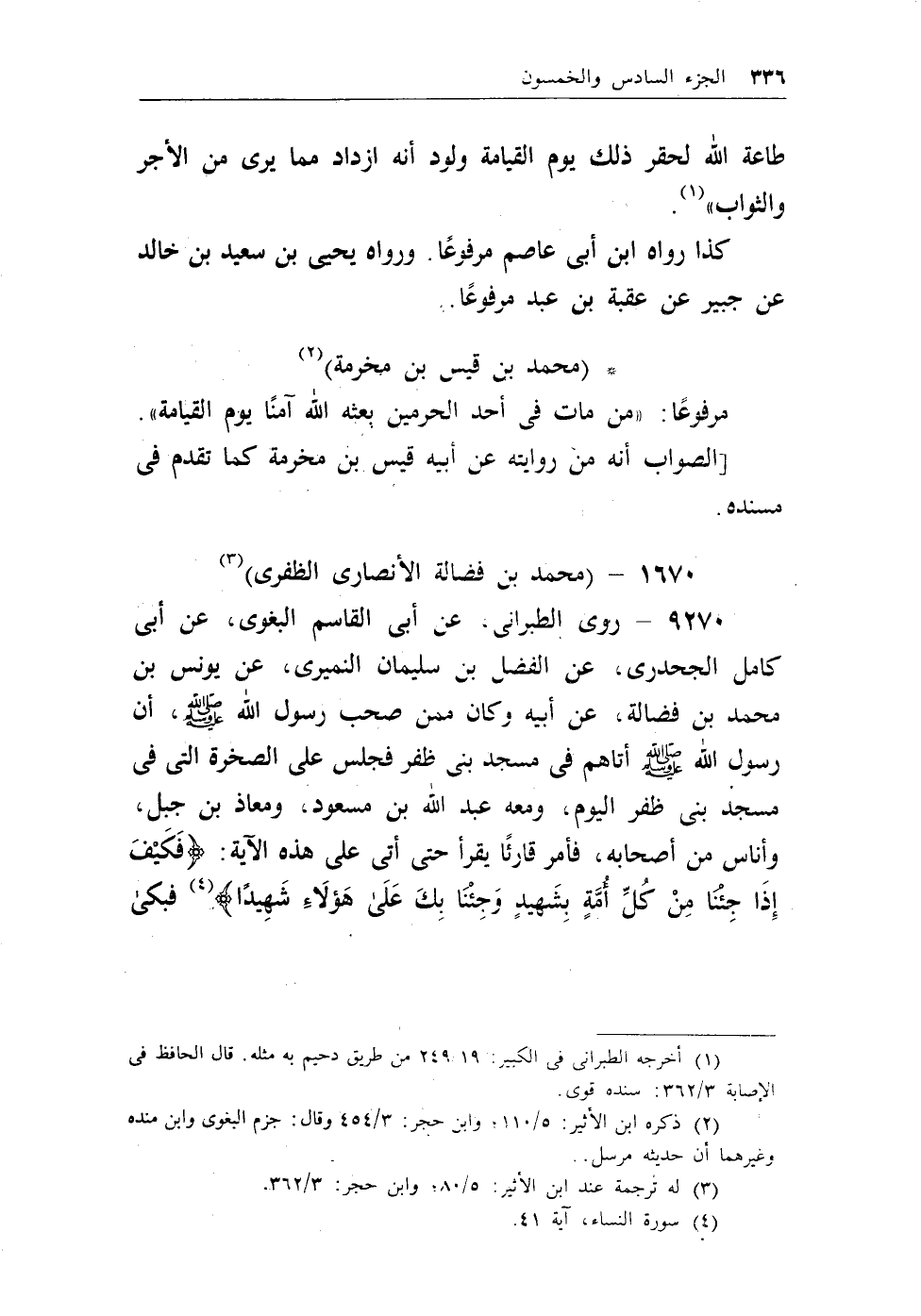 9270 - روى الطبراني، عن أبي القاسم البغوي، عن أبي كامل الجحدري، عن الفضل بن سليمان النميري، عن يونس بن محمد بن فضالة، عن أبيه وكان ممن صحب رسول الله - صلى الله عليه وسلم -، أن رسول الله - صلى الله عليه وسلم - أتاهم في مسجد بني ظفر فجلس على الصخرة التي في مسجد بني ظفر اليوم، ومعه عبد الله بن مسعود، ومعاذ بن جبل، وأناس من أصحابه، فأمر قارئاً يقرأ حتى أتى على هذه الآية: {فَكَيْفَ إِذَا جِئْنَا مِنْ كُلِّ أُمَّةٍ بِشَهِيدٍ وَجِئْنَا بِكَ عَلَى هَؤُلاءِ شَهِيدًا} (¬2) ، فبكى
