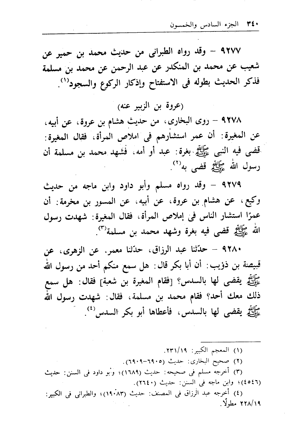 9280 - حدثنا عبد الرزاق، حدثنا معمر، عن الزهري، عن قبيصة بن ذؤيب: أن أبا بكر قال: هل سمع منكم أحد من رسول الله - صلى الله عليه وسلم - يقضي لها بالسدس؟ [فقام المغيرة بن شعبة] فقال: هل سمع ذلك معك أحد؟ فقام محمد بن مسلمة، فقال: شهدت رسول الله - صلى الله عليه وسلم - يقضى لها بالسدس، فأعطاها أبو بكر السدس (¬4) .