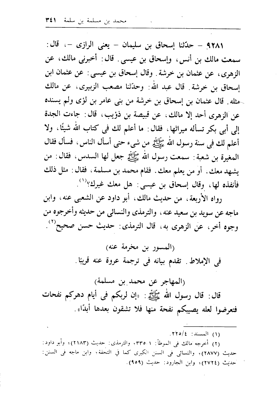 (¬2) أخرجه مالك في الموطأ، 1/335؛ والترمذي: حديث (2183) ؛ وأبو داود: حديث (2877) ؛ والنسائي في السنن الكبرى كما في التحفة؛ وابن ماجة في السنن: حديث (2724) ؛ وابن الجارود: حديث (959) .