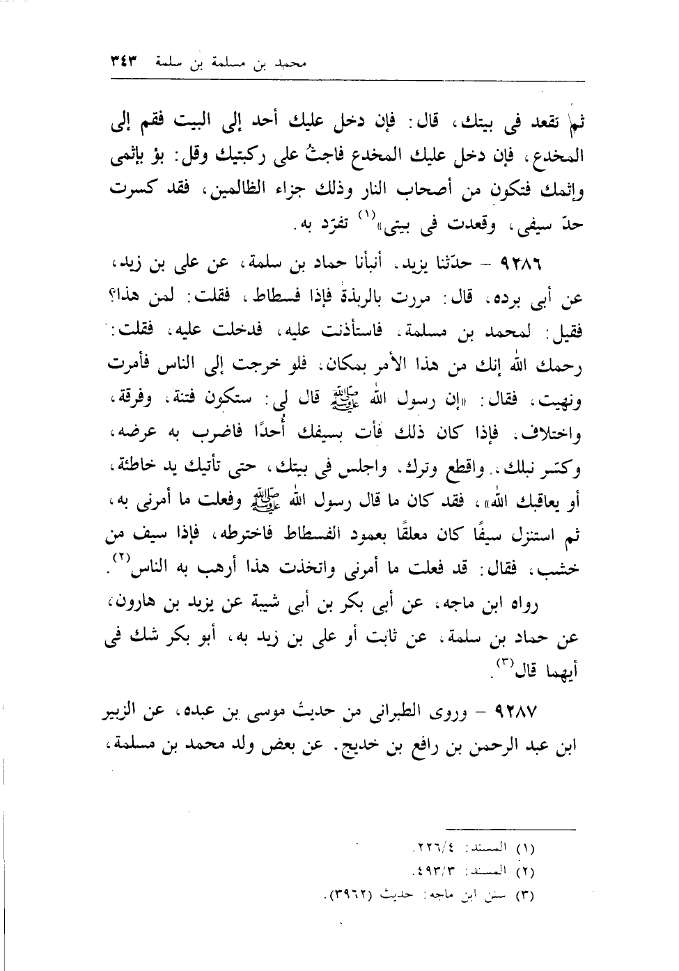 9287 - وروى الطبراني من حديث موسى بن عبده، عن الزبير بن عبد الرحمن ابن رافع بن خديج، عن بعض ولد محمد بن مسلمة،