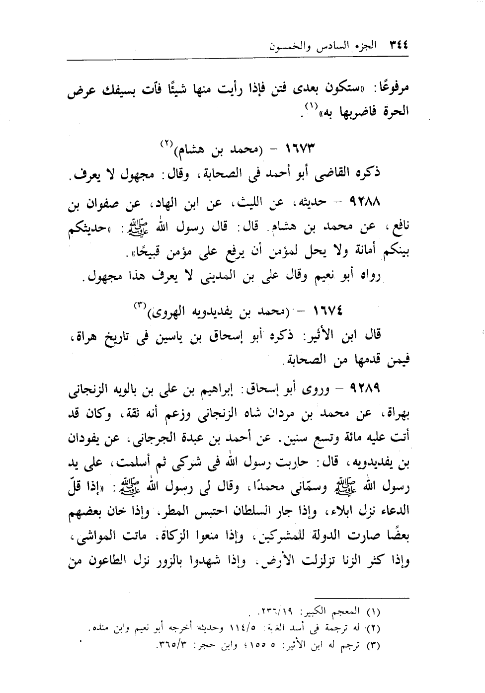 9289 - وروى أبو إسحاق: إبراهيم بن علي بن بالويه الزنجاني بهراة، عن محمد بن مردان شاه الزنجاني وزعم أنه ثقة، وكان قد أتت عليه مائة وتسع سنين، عن أحمد بن عبدة الجرجاني، عن يفودان بن يفديدويه، قال: حاربت رسول الله في شركي ثم أسلمت، على يد رسول الله - صلى الله عليه وسلم - وسماني محمداً، وقال لي رسول الله - صلى الله عليه وسلم -: ((إذا قل الدعاء نزل البلاء، وإذا جار السلطان احتبس المطر، وإذا خان بعضهم بعضاً صارت الدولة للمشركين، وإذا منعوا الزكاة، ماتت المواشي، وإذا كثر الزنا تزلزلت تأرض، وإذا شهدوا بالزور نزل الطاعون من