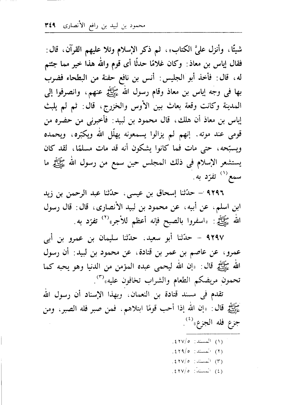 9296 - حدثنا إسحاق بن عيسى، حدثنا عبد الرحمن بن زيد بن أسلم، عن أبيه، عن محمود بن لبيد الأنصاري، قال: قال رسول الله - صلى الله عليه وسلم -: ((أسفروا بالصبح فإنه أعظم للأجر)) (¬1) . تفرد به.