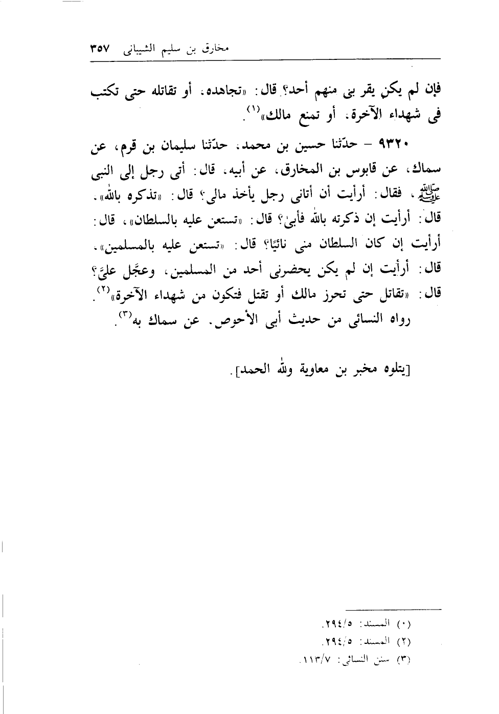 9320 - حدثنا حسين بن محمد، حدثنا سليمان بن قرم، عن سماك، عن قابوس ابن المخارق، عن أبيه، قال: أتى رجل إلى النبي - صلى الله عليه وسلم -، فقال: أرايت إن أتاني رجل يأخذ مالي؟ قال: ((تذكره بالله)) ، قال: أرأيت إن ذكرته بالله فأبى؟ قال: ((تسعن عليه بالسلطان)) ، قال: أرأيت إن كان السلطان مني نائياً؟ قال: ((تستعن عليه بالمسلمين)) ، قال: أرأيت إن لم يكن يحضرني أحد من المسلمين، وعجَّل عليَّ؟ قال: ((تقاتل حتى تحرز مالك أو تقتل فتكون من شهداء الآخرة)) (¬1) .