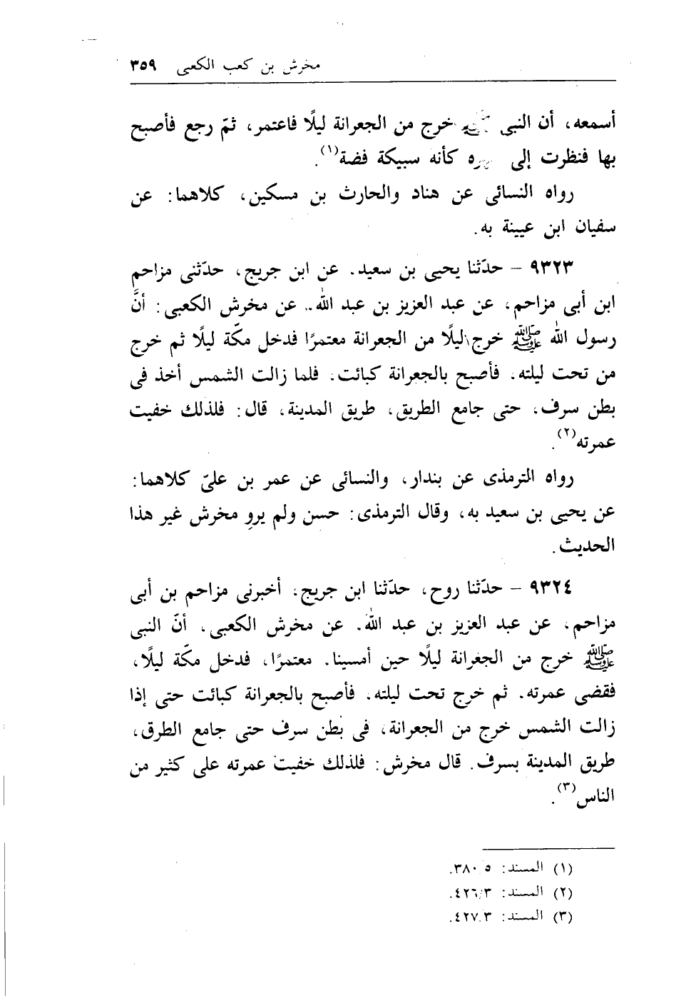 9324 - حدثنا روح، حدثنا ابن جريج، أخبرني مزاحم بن أبي مزاحم، عن عبد العزيز بن عبد الله، عن مخرش الكعبي، أن النبي - صلى الله عليه وسلم - خرج من الجعرانة ليلاً حين أمسينا، معتمراً، فدخل مكة ليلاً، فقضى عمرته، ثم خرج تحت ليلته، فأصبح بالجعرانة كبائت حتى إذا زالت الشمس خرج من الجعرانة، في بطن سرف حتى جامع الطرق، طريق المدينة بسرف. قال مخشر: فلذلك خفيت عمرته على كثير من الناس (¬2) .
