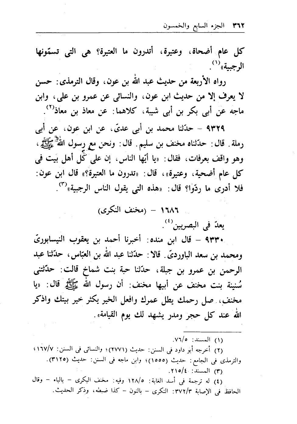9329 - حدثنا محمد بن أبي عدي، عن ابن عون، عن أبي رملة. قال: حدثناه مخنف بن سليم. قال: ونحن مع رسول الله - صلى الله عليه وسلم -، وهو واقف بعرفات، فقال: ((ياأيها الناس، إن على كل أهل بيت في كل عام أضحية، وعتيرة)) ، قال: ((تدرون ما العتيرة؟)) قال ابن عون: فلا أدري ماردوا؟ قال: ((هذه التي يقول الناس الرجبية)) (¬1) .