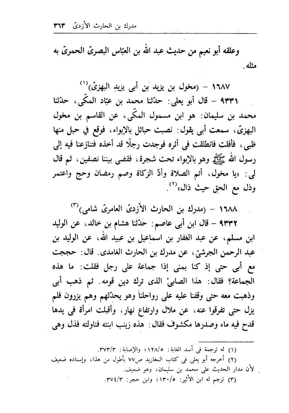 9332 - قال ابن أبي عاصم: حدثنا هشام بن خالد، عن الوليد بن مسلم، عن عبد الغفار بن إسماعيل بن عبيد الله، عن الوليد بن عبد الرحمن الجرشي، عن مدرك ابن الحارث الغامدي. قال: حججت مع أبي حتى إذ كنا بمنى إذا جماعة على رجل فقلت: ماهذه الجماعة؟ فقال: هذا الصابئ الذي ترك دين قومه، ثم ذهب أبي وذهبت معه حتى وقفنا عليه على رواحلنا وهو يحدثهم وهم يزرون فلم يزل حتى تفرقوا عنه، عن ملال وارتفاع نهار، واقبلت إمرأة في يدها قدح فيه ماء وصدرها مكشوف فقال: هذه زينب ابنته فناولته فذل وهي
