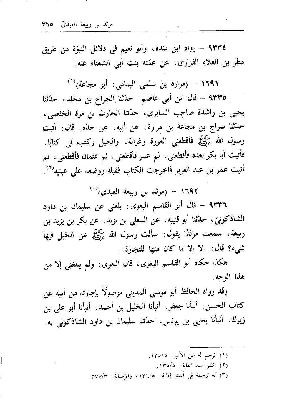 9335 - قال ابن أبي عاصم: حدثنا الجراح بن مخلد، حدثنا يحيى بن راشدة صاحب السابري، حدثنا الحارث بن مرة الخثعمي، حدثنا سراج بن مجاعة بن مرارة، عن أبيه، عن جده. قال: أتيت رسول الله - صلى الله عليه وسلم - فأقطعني الغورة وغرابة، والحبل وكتب لي كتاباً، فأتيت أبا بكر بعده فأقطعني، ثم عمر فأقطعني، ثم عثمان فأقطعني، ثم أتيت عمر بن عبد العزيز فأخرجت الكتاب فقبله ووضعه على عينيه (¬2) .