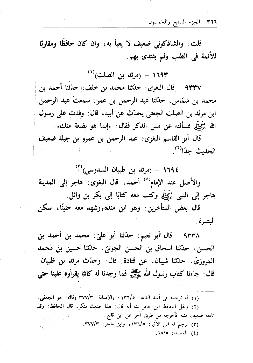 9338 - قال أبو نعيم: حدثنا أبو علي: محمد بن أحمد بن الحسن، حدثنا إسحاق ابن الحسن الجوني، حدثنا حسين بن محمد المروزي، حدثنا شيبان، عن قتادة، قال: وحدث مرثد بن ظبيان. قال: جاءنا كتاب رسول الله - صلى الله عليه وسلم - فما وجدنا له كاتباً يقرأوه علينا حتى