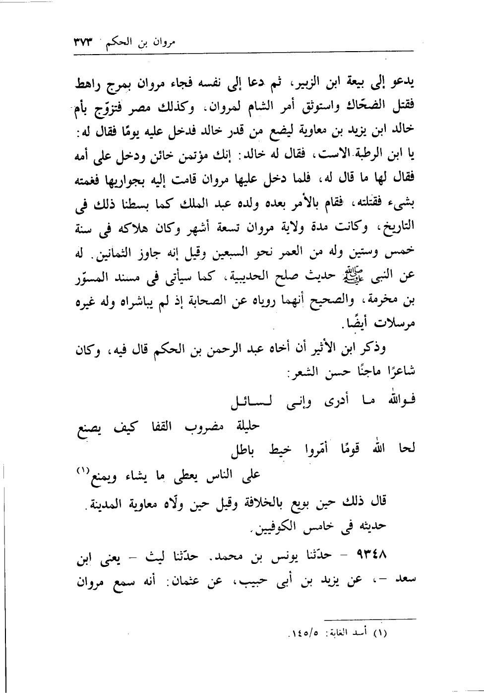 9348 - حدثنا يونس بن محمد، حدثنا ليث -يعني ابن سعد-، عن يزيد بن أبي حبيب، عن عثمان: أنه سمع مروان