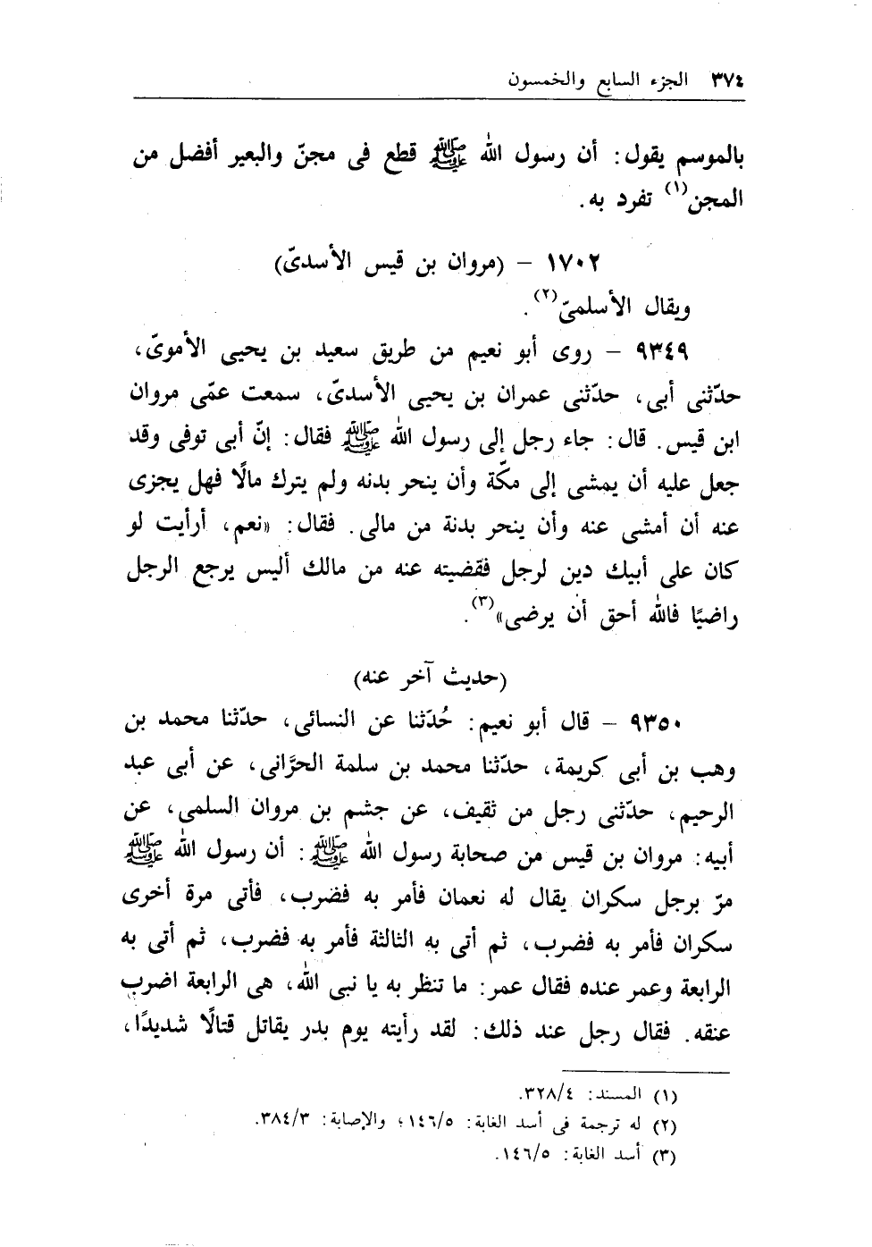 9350 - قال أبو نعيم: حدثنا عن النسائي، حدثنا محمد بن وهب بن أبي كريمة، حدثنا محمد بن سلمة الحرَّاني، عن أبي عبد الرحيم، حدثني رجل من ثقيف، عن جشم بن مروان السلمي، عن أبيه: مروان بن قيس من صحابة رسول الله - صلى الله عليه وسلم -: أن رسول الله - صلى الله عليه وسلم - مر برجل سكران يقال له نعمان فأمر به فضرب، ثم أتى به الرابعة وعمر عنده فقال عمر: ماتنظر به يانبي الله، هي الرابعة اضرب عنقه. فقال رجل عند ذلك: لقد رأيته يوم بدر يقاتل قتالاً شديداً،