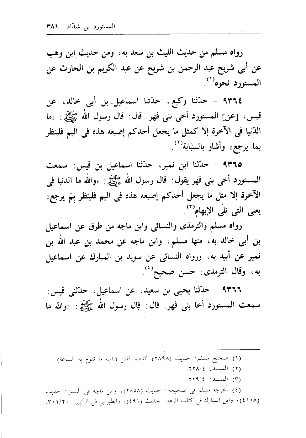 9365 - حدثنا ابن نمير، حدثنا إسماعيل بن قيس: سمعت المستورد أخى بني فهر يقول: قال رسول الله - صلى الله عليه وسلم -: ((والله ما الدنيا في الآخرة إلا مثل مايجعل أحدكم إصبعه هذه في اليم فلينظر بم يرجع)) يعني التي تلي الإبهام (¬2) .