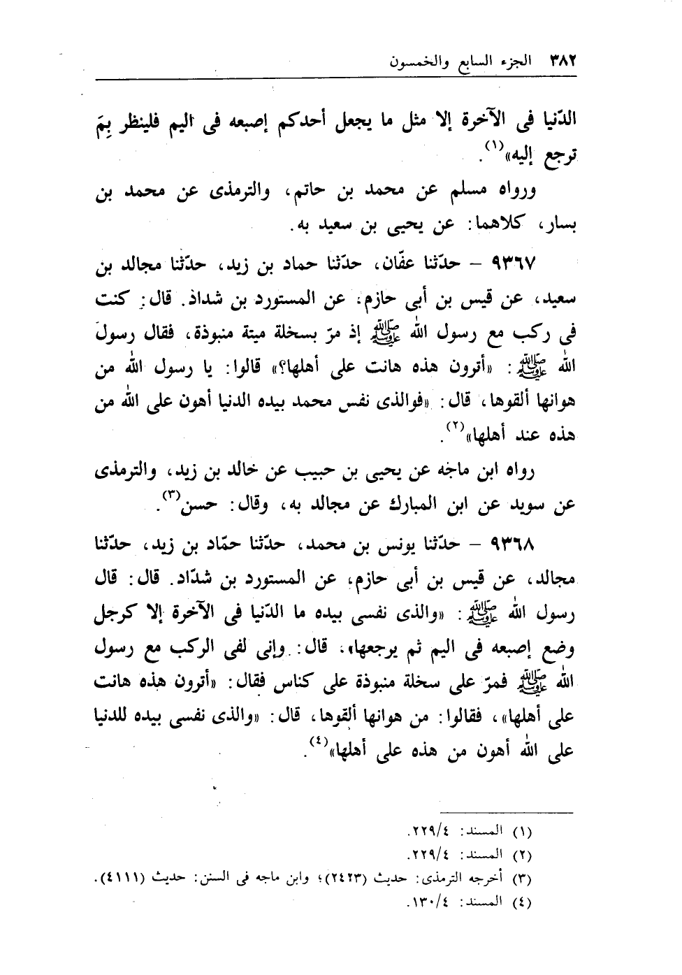 9368 - حدثنا يونس بن محمد، حدثنا حماد بن زيد، حدثنا مجالد، عن قيس ابن أبي حازم، عن المستورد بن شداد. قال: قال رسول الله - صلى الله عليه وسلم -: ((والذي نفسي بيده ما الدنيا في الآخرة إلا كرجل وضع إصبعه في اليم ثم يرجعها)) ، قال: وإني لفي الركب مع رسول الله - صلى الله عليه وسلم - فمر على سخلة منبوذة على كناس فقال: ((أترون هذه هانت على أهلها)) ، فقالوا: من هوانها ألقوها، قال: ((والذي نفسي بيده للدنيا على الله أهون من هذه على أهلها)) (¬3) .