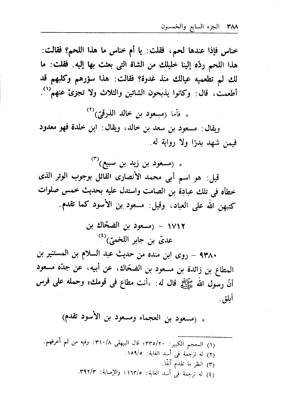 9380 - روى ابن منده من حديث عبد السلام بن المستنير بن المطاع بن زائدة ابن مسعود بن الضحاك، عن أبيه، عن جده مسعود أن رسول الله - صلى الله عليه وسلم - قال له: ((أنت مطاع في قومك)) وحمله على فرس أبلق.