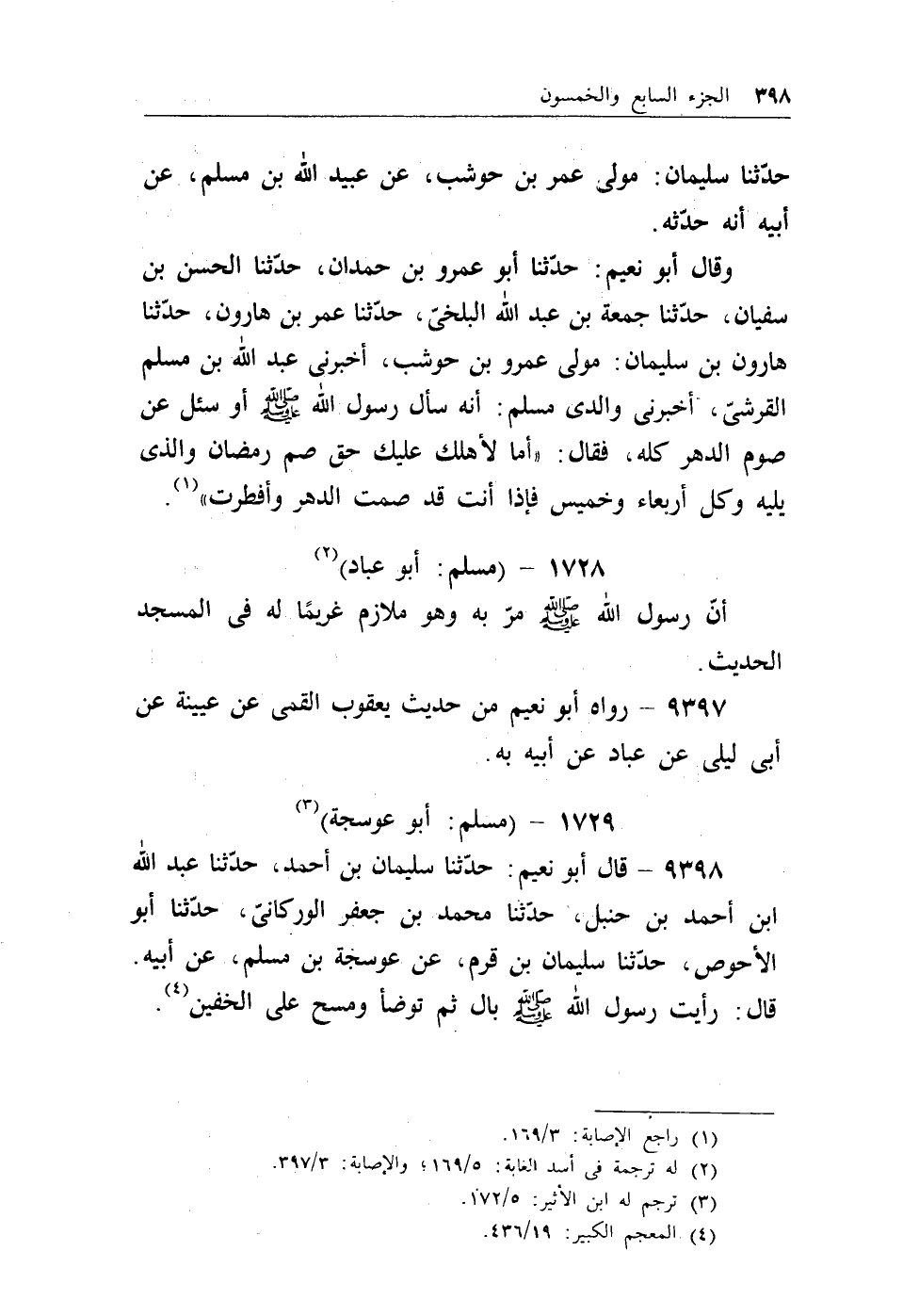 9398 - قال أبو نعيم: حدثنا سليمان بن أحمد، حدثنا عبد الله بن أحمد بن حنبل، حدثنا محمد بن جعفر الوركاني، حدثنا أبو الأحوص، حدثنا سليمان بن قرم، عن عوسجة بن مسلم، عن أبيه. قال: رأيت رسول الله - صلى الله عليه وسلم - بال ثم توضأ ومسح على الخفين (¬3) .