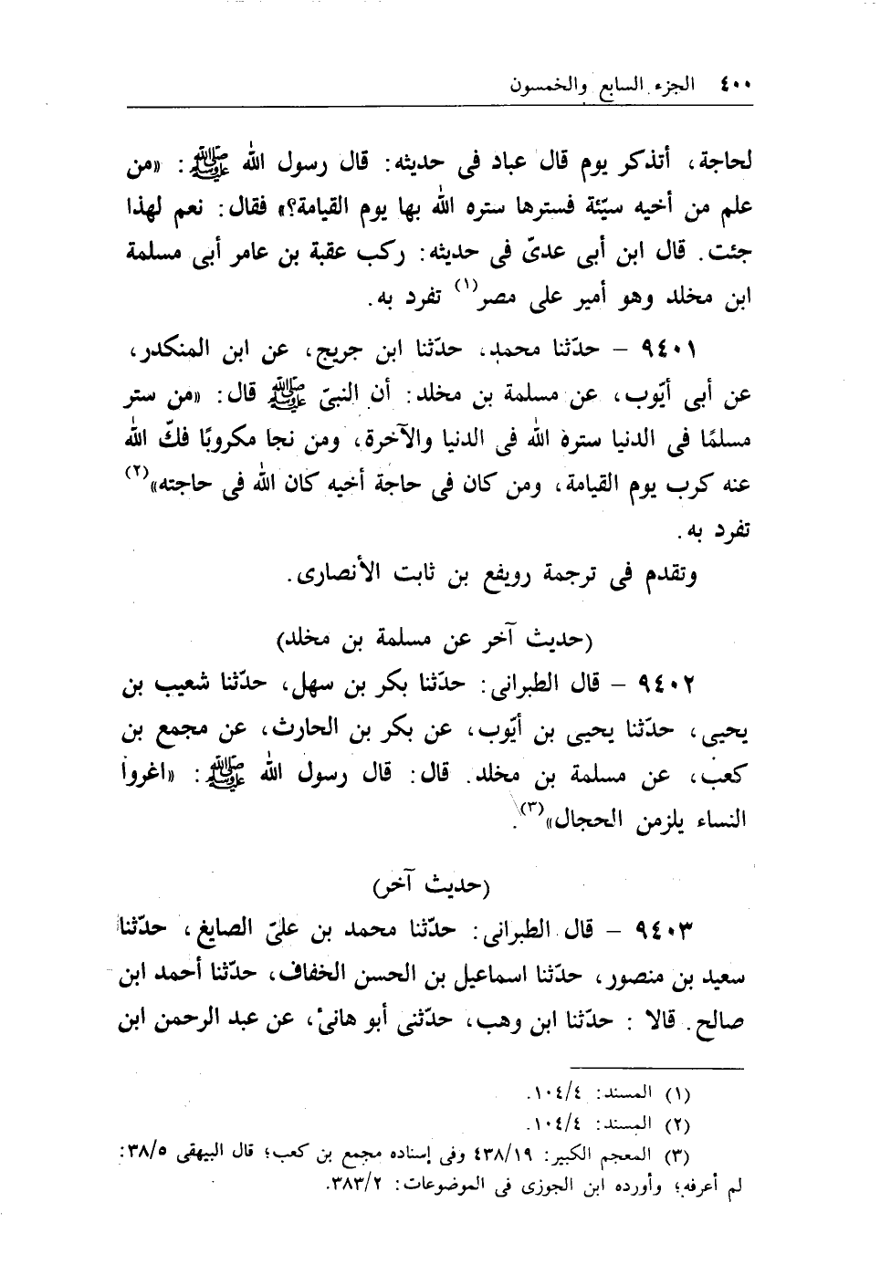 9403 - قال الطبراني: حدثنا محمد بن علي الصايغ، حدثنا سعيد بن منصور، حدثنا إسماعيل بن الحسن الخفاف، حدثنا أحمد ابن صالح. قالا: حدثنا ابن وهب، حدثني أبو هانئ، عن عبد الرحمن ابن