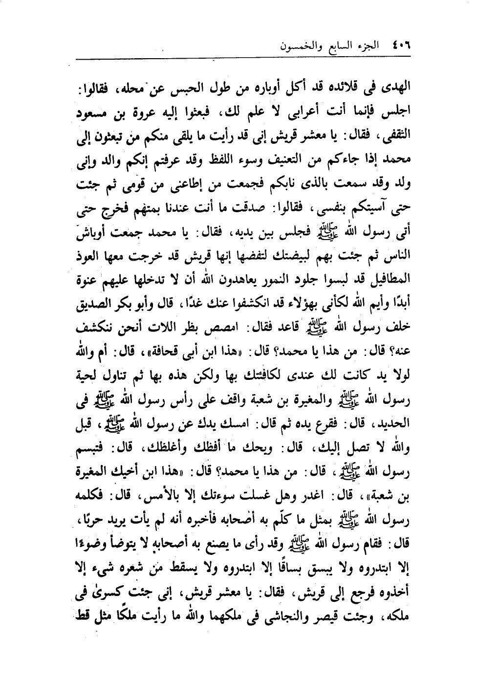 الهدى في قلائده قد أكل أوباره من طول الحبس عن محله، فقالوا: اجلس فإنما أنت أعرابي لاعلم لك، فبعثوا إليه عروة بن مسعود الثقفي، فقال: يامعشر قريش إني قد رأيت مايلقى منكم من تبعثون إلى محمد إذا جاءكم من التعنيف وسوء اللفظ وقد عرفتم أنكم والد وإني ولد وقد سمعت بالذي نابكم فجمعت من أطاعني من قومي ثم جئت حتى آسيتكم بنفسي، فقالوا: صدقت ماأنت عندنا بمتهم فخرج حتى أتي رسول الله - صلى الله عليه وسلم - فجلس بين يديه، فقال: يامحمد جمعت أوباش الناس ثم جئت بهم لبيضتك لتفضها إنها قريش قد خرجت معها العوذ المطافيل قد لبسوا جلود النمور يعاهدون الله أن لاتدخلها عليهم عنوة أبداً وأيم الله لكأني بهؤلاء قد انكشفوا عنك غداً، قال وأبو بكر الصديق خلف رسول الله - صلى الله عليه وسلم - قاعد فقال: امصص بظر اللات أنحن ننكشف عنه؟ قال: من هذا يامحمد؟ قال: ((هذا ابن أبي قحافة)) ، قال: أم والله لولا يد كانت لك عندي لكافئتك بها ولكن هذه بها ثم تناول لحية رسول الله - صلى الله عليه وسلم - والمغيرة بن شعبة واقف على رأس رسول الله - صلى الله عليه وسلم - في الحديد، قال: فقرع يده ثم قال: امسك يدك عن رسول الله - صلى الله عليه وسلم -، قبل والله لاتصل إليك، قال: ويحك ما أفظك وأغلظك، قال: فتبسم رسول الله - صلى الله عليه وسلم -، قال: من هذا يامحمد؟ قال: ((هذا ابن أخيك المغيرة بن شعبة)) ، قال: اغدر وهل غسلت سوءتك إلا