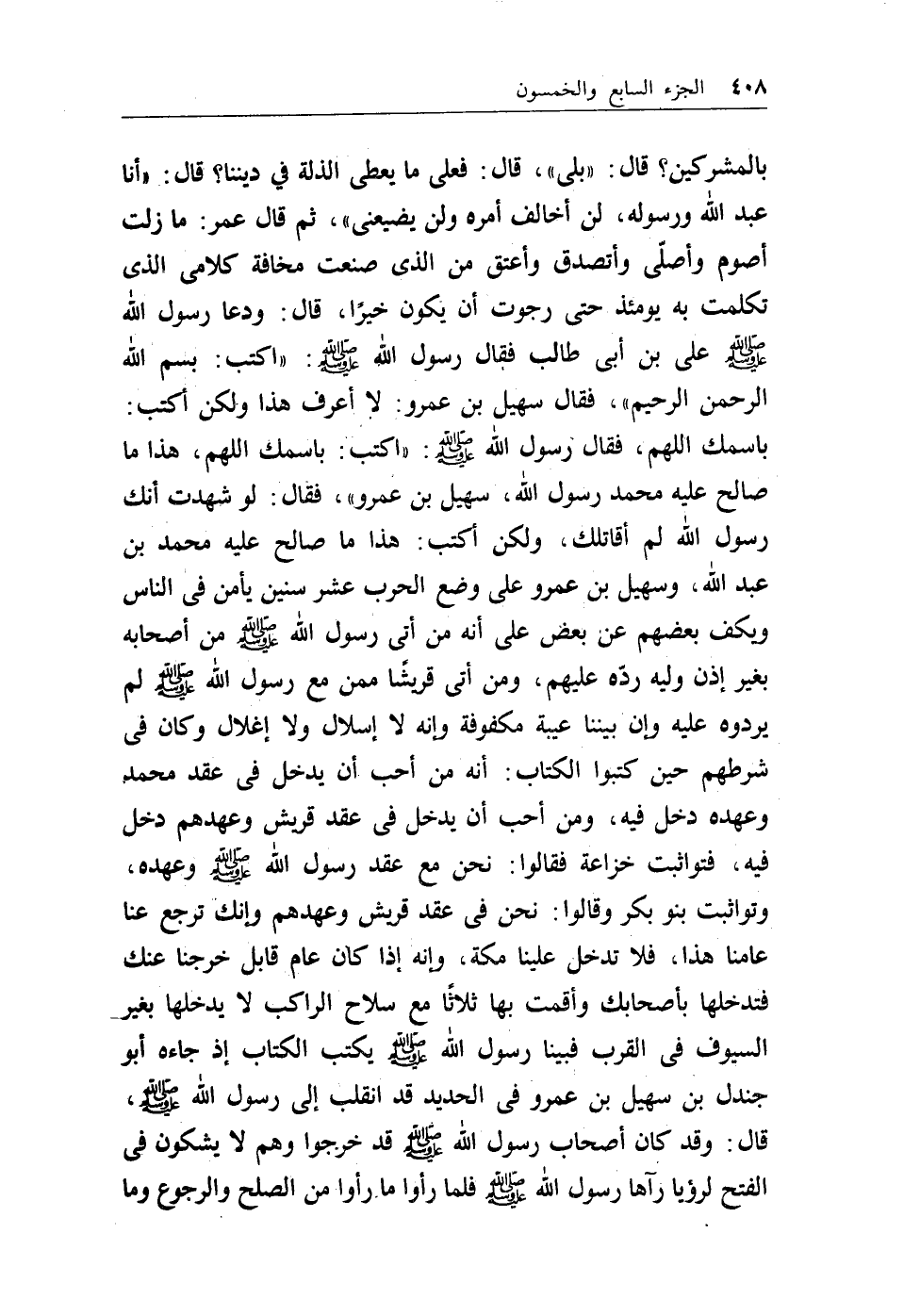 بالمشركين؟ قال: ((بلى)) ، قال: فعلى مايعطى الذلة في ديننا؟ قال: ((أنا عبد الله ورسوله، لن أخالف أمره ولن يضيعني)) ، ثم قال عمر: مازلت أصوم وأصلى وأتصدق وأعتق من الذي صنعت مخافة كلامي الذي تكلمت به يومئذ حتى رجوت أن يكون خيراً، قال: ودعا رسول الله - صلى الله عليه وسلم - علي بن أبي طالب فقال رسول الله - صلى الله عليه وسلم -: ((اكتب: بسم الله الرحمن الرحيم)) ، فقال سهيل بن عمرو: لا أعرف هذا ولكن أكتب: باسمك اللهم، فقال رسول الله - صلى الله عليه وسلم -: ((اكتب: باسمك اللهم، هذا ماصالح عليه محمد رسول الله، سهيل بن عمرو)) ، فقال: لو شهدت أنك رسول الله لم أقاتلك، ولكن أكتب: هذا ماصالح عليه محمد بن عبد الله، وسهيل بن عمرو على وضع الحرب عشر سنين يأمن في الناس ويكف بعضهم عن بعض على أنه من أتى رسول الله - صلى الله عليه وسلم - من أصحابه بغير إذن وليه رده عليهم، ومن أتي قريشاً ممن مع رسول الله - صلى الله عليه وسلم - لم يردوه عليه وإن بيننا عيبة مكفوفة وإنه لا إسلال ولا إغلال وكان في شرطهم حين كتبوا الكتاب: أنه من أحب أن يدخل في عقد محمد وعهده دخل فيه، ومن أحب أن يدخل في عقد قريش وعهدهم دخل فيه، فتواثبت خزاعة فقالوا: نحن مع عقد رسول الله - صلى الله عليه وسلم - وعهده، وتواثبت بنو بكر وقالوا: نحن في عقد قريش وعهدهم وإنك ترجع عنا عامنا هذا، فلا تدخل علينا مكة، وإنه إذا كان عام قابل خرجنا عنك فتدخلها بأصحابك وأقمت بها ثلاثاً مع