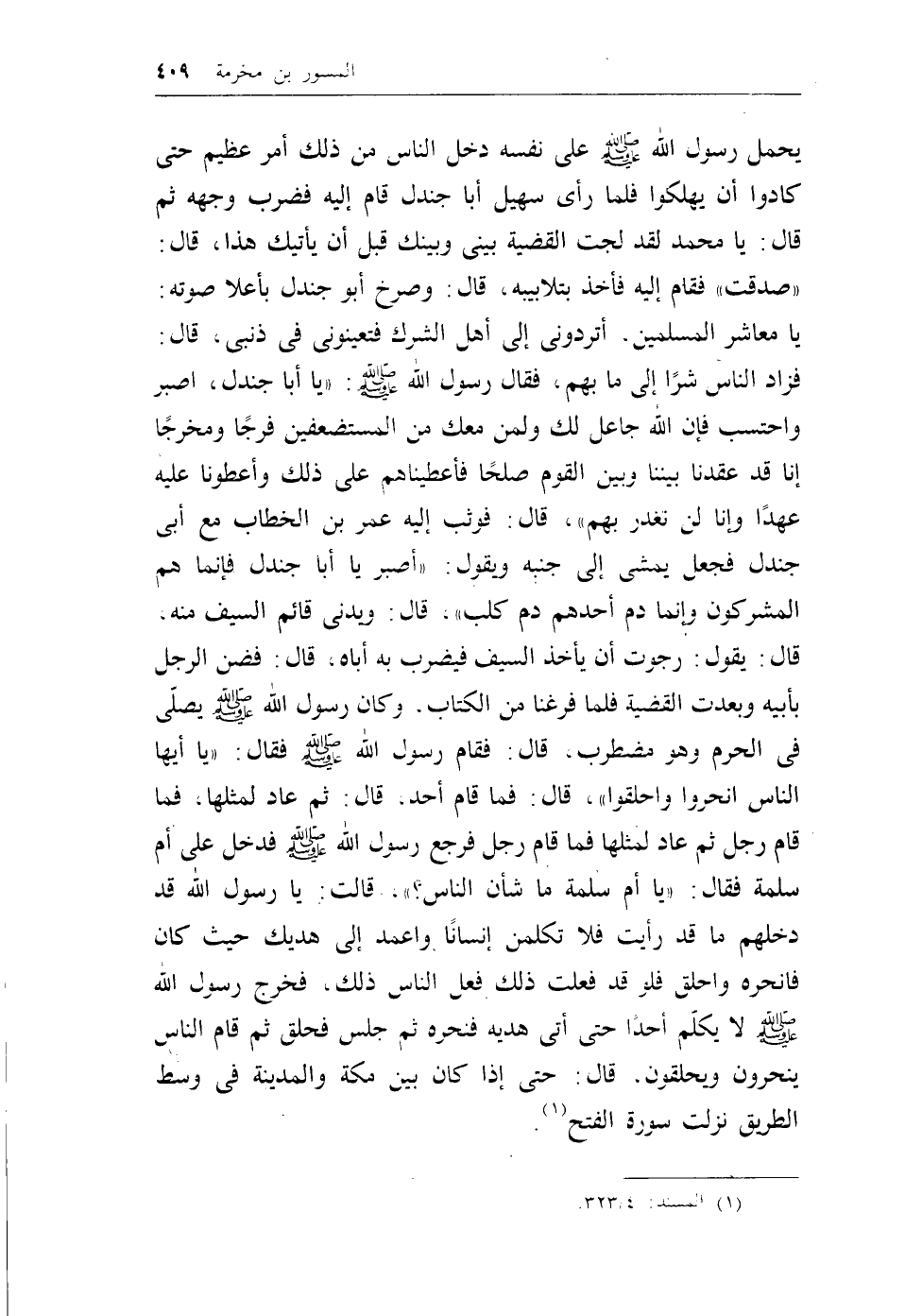 يحمل رسول الله - صلى الله عليه وسلم - على نفسه دخل الناس من ذلك أمر عظيم حتى كادوا أن يهلكوا فلما رأى سهيل أبا جندل قام إليه فضرب وجهه ثم قال: يامحمد لقد لجت القضية بيني وبينك قبل أن يأتيك هذا، قال: ((صدقت)) فقام إليه فأخذ بتلابيبه، قال: وصرخ أبو جندل بأعلا صوته: يامعاشر المسلمين، أتردوني إلى أهل الشرك فتعينوني في ذنبي، قال: فزاد الناس شراً إلى مابهم، فقال رسول الله - صلى الله عليه وسلم -: ((ياأبا جندل، اصبر واحتسب فإن الله جاعل لك ولمن معك من المستضعفين فرجاً ومخرجاً إنا قد عقدنا بيننا وبين القوم صلحاً فأعطيناهم على ذلك وأعطونا عليه عهداً وإنا لن نغدر بهم)) ، قال: فوثب إليه عمر ابن الخطاب مع أبي جندل فجعليمشي إلى جنبه ويقول: ((اصبر يا أبا جندل فإنما هم المشركون وإنما دم أحدهم دم كلب)) ، قال: ويدني قائم السيف منه، قال: يقول: رجوت أن يأخذ السيف فيضرب به أباه، قال: فضن الرجل بأبيه وبعدت القضية فلما فرغنا من الكتاب، وكان رسول الله - صلى الله عليه وسلم - يصلي في الحرم وهو مضطرب، قال: فقام رسول الله - صلى الله عليه وسلم - فقال: ((يا أيها الناس انحروا واحلقوا)) ، قال: فما قام أحد، قال: ثم عاد لمثلها، فما قام رجل ثم عاد لمثلها فما قام رجل فرجع رسول الله - صلى الله عليه وسلم - فدخل على أم سلمة فقال: ((ياأم سلمة ماشأن الناس؟)) ، قالت: يارسول الله قد دخلهم ماقد رأيت فلاتكلمن إنساناً واعمد إلى هديك حيث كان فانحره واحلق فلو قد فعلت ذلك فعل الناس ذلك، فخرج