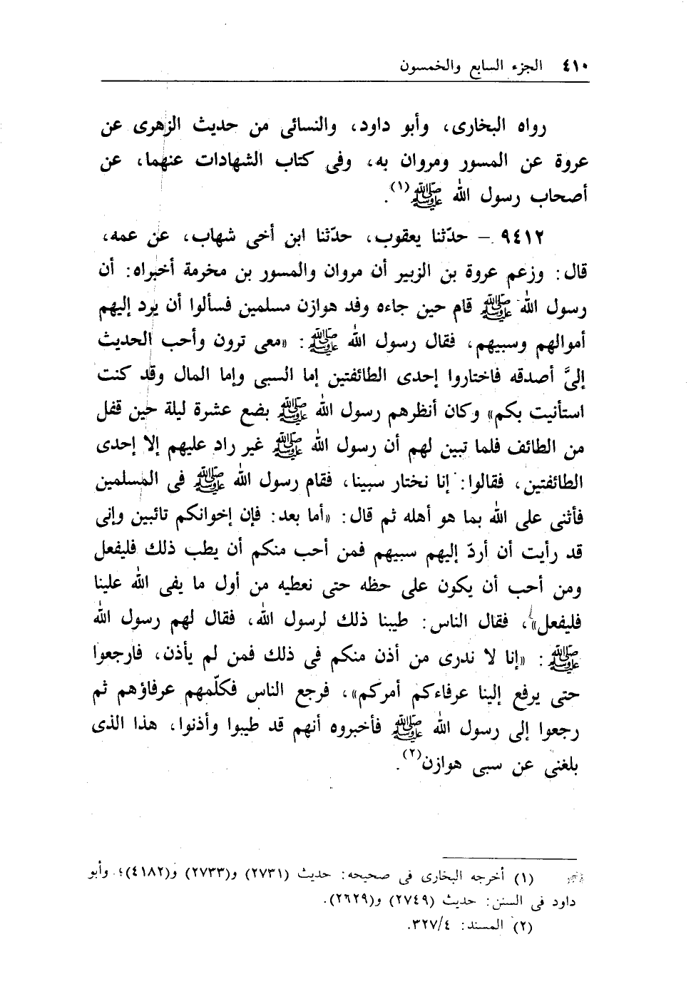 9412 - حدثنا يعقوب، حدثنا ابن أخي شهاب، عن عمه، قال: وزعم عروة ابن الزبير أن مروان والمسور بن مخرمة أخبراه: أن رسول الله - صلى الله عليه وسلم - قام حين جاءه وفد هوازن مسلمين فسألوا أن يرد إليهم أموالهم وسبيهم، فقال رسول الله - صلى الله عليه وسلم -: ((معي ترون وأحب الحديث إليَّ اصدقه فاختاروا إحدى الطائفتين إما السبى وإما المال وقد كنت استأنيت بكم)) وكان أنظرهم رسول الله - صلى الله عليه وسلم - بضع عشرة ليلة حين قفل من الطائف فلما تبين لهم أن رسول الله - صلى الله عليه وسلم - غير راد عليهم إلا إحدى الطائفتين فقالوا: إنا نختار سبينا، فقام رسول الله - صلى الله عليه وسلم - في المسلمين فأثنى على الله بما هو أهله ثم قال: ((أما بعد: فإن إخوانكم تائبين وإني قد رأيت أن أرد إليهم سبيهم فمن أحب منكم أن يطب ذلك فليفعل ومن أحب أن يكون على حظه حتى نعطيه من أول مايفي الله علينا فليفعل)) ، فقال الناس: طيبنا ذلك لرسول الله، فقال لهم رسول الله - صلى الله عليه وسلم -: ((إنا لاندري من أذن منكم في ذلك فمن لم يأذن، فارجعوا حتى يرفع إلينا عرفاءكم أمركم)) ، فرجع الناس فكلمهم عرفاؤهم ثم رجعوا إلى رسول الله - صلى الله عليه وسلم - فأخبروه أنهم قد طيبوا وأذنوا، هذا الذي بلغني عن سبى هوازن (¬1) .