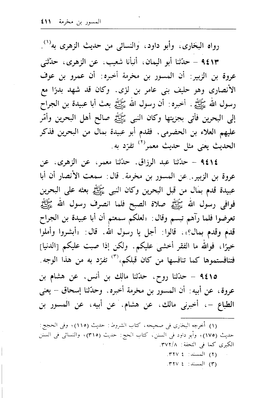 9413 - حدثنا أبو اليمان، أنبأنا شعيب، عن الزهري، حدثني عروة بن الزبير: أن المسور بن مخرمة أخبره: أن عمرو بن عوف الأنصاري وهو حليف بني عامر بن لؤي، وكان قد شهد بدراً مع رسول الله - صلى الله عليه وسلم -، أخبره: أن رسول الله - صلى الله عليه وسلم - بعث أبا عبيدة بن الجراح إلى البحرين فأتى بجزيتها وكان النبي - صلى الله عليه وسلم - صالح أهل البحرين فذكر الحديث يعني مثل حديث معمر (¬1) . تفرد به.