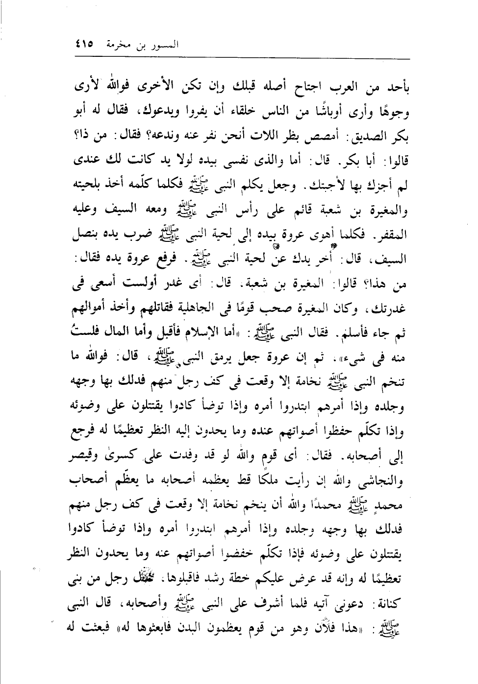 بأحد من العرب اجتاح أصله قبلك وإن تكن الأخرى فوالله لأرى وجوهاً وأرى أوباشاً من الناس خلقاء أن يفروا ويدعوك، فقالو له أبو بكر الصديق: أمصص بظر اللات أنحن نفر عنه وندعه؟ فقال: من ذا؟ قالوا: أبا بكر، قال: أما والذي نفسي بيده لولا يد كانت لك عندي لم أجزك بها لأجبتك، وجعل بكلم النبي - صلى الله عليه وسلم - فكلما كلمه أخذ بلحيته والمغيرة بن شعبة قائم على رأس النبي - صلى الله عليه وسلم - ومعه السيف وعليه المقفر، فكلما أهوى عروة بيده إلى لحية النبي - صلى الله عليه وسلم - ضرب يده بنصل السيف، قال: أخر يدك عن لحية النبي - صلى الله عليه وسلم -، فرفع عروة يده فقال: من هذا؟ قالوا: المغيرة بن شعبة، قال: أي غدر أو لست اسعى في غدرتك، وكان المغيرة صحب قوماً في الجاهلية فقاتلهم وأخذ أموالهم ثم جاء فأسلم، فقال النبي - صلى الله عليه وسلم -: ((أما الإسلام فأقبل وأما المال فلستُ منه في شيء)) ، ثم إن عروة جعل يرمق النبي - صلى الله عليه وسلم -، قال: فوالله ماتنخم النبي - صلى الله عليه وسلم - نخامة إلا وقعت في كف رجل منهم فدلك بها وجهه وجلده وإذا أمرهم ابتدروا أمره وإذا توضأ كادوا يقتتلون على وضوئه وإذا تكلم حفظوا أصواتهم عنده ومايحدون إليه النظر تعظيماً له فرجع إلى أصحابه، فقال: أي قوم والله لو قد وفدت على كسرى وقيصر والنجاشي والله إن رأيت ملكاً قط يعظمه أصحابه مايعظم أصحاب محمد - صلى الله عليه وسلم - محمداً والله أن ينخم نخامة إلا وقعت في كف رجل منهم فدلك بها وجهه وجلده وإذا أمرهم ابتدروا أمره