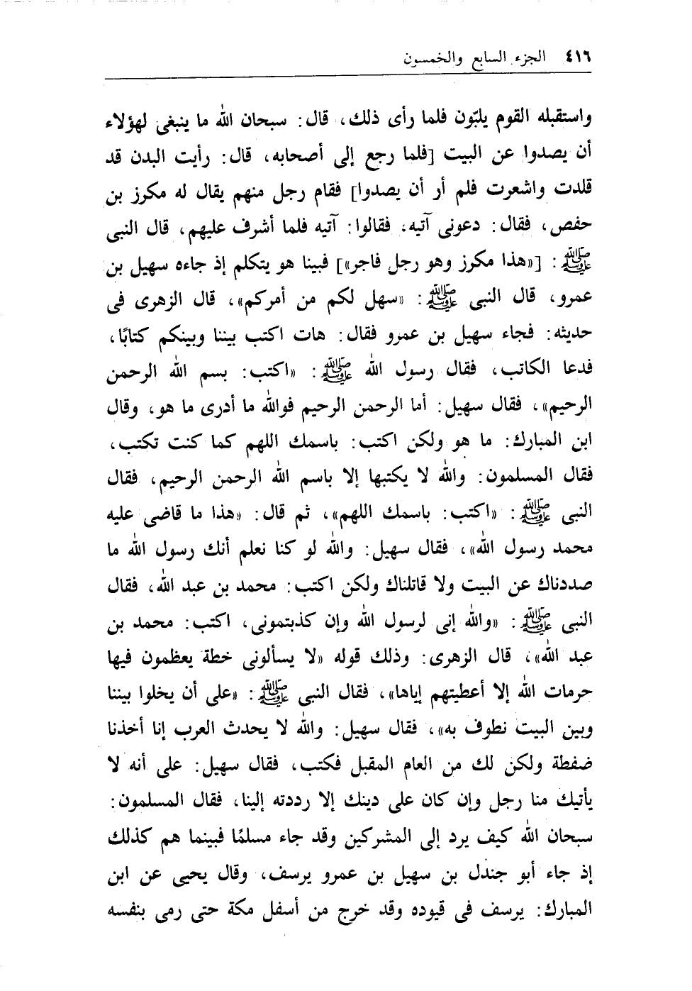 واستقبله القوم يلبون فلما رأى ذلك، قال: سبحان الله ماينبغي لهؤلاء أن يصدوا عن البيت [فلما رجع إلى أصحابه، قال: رأيت البدن قد قلدت واشتعرت فلم أر أن يصدوا] فقام رجل منهم يقال له مكرز بن حفص، فقال: دعوني آتيه، فقالوا: آتيه فلما أشرف عليهم، قال النبي - صلى الله عليه وسلم -: [ ((هذا مكرز وهو رجل فاجر)) ] فبينا هو يتكلم إذ جاءه سهيل بن عمرو، قال النبي - صلى الله عليه وسلم -: ((سهل لكم من أمركم)) ، قال الزهري في حديثه: فجاء سهيل بن عمرو فقال: هات اكتب بيننا وبينكم كتاباً، فدعا الكاتب، فقال رسول الله - صلى الله عليه وسلم -: ((اكتب: بسم الله الرحمن الرحيم)) ، فقال سهيل: أما الرحمن الرحيم فوالله ما أدري ماهو، وقال ابن المبارك: ماهو ولكن اكتب: باسمك اللهم كما كنت تكتب، فقال المسلمون: والله لايكتبها إلا باسم الله الرحمن الرحيم، فقال النبي - صلى الله عليه وسلم -: ((اكتب: باسمك اللهم)) ، ثم قال: ((هذا ماقاضى عليه محمد رسول الله)) ، فقال سهيل: والله لو كنا نعلم أنك رسول الله ماصددناك عن البيت ولا قاتلناك ولكن اكتب: محمد بن عبد الله، فقال النبي - صلى الله عليه وسلم -: ((والله إني لرسول الله وإن كذبتموني، اكتب: محمد بن عبد الله)) ، قال الزهري: وذلك قوله ((لايسألوني خطة يعظمون فيها حرمات الله إلا أعطيتهم إياها)) ، فقال النبي - صلى الله عليه وسلم -: ((على أن يخلوا بيننا وبين البيت نطوف به)) ، فقال سهيل: والله لايحدث العرب إنا أخذنا ضفطة ولكن لك من العام المقبل فكتب، فقال سهيل: على أنه لايأتيك منا رجل وإن كان على