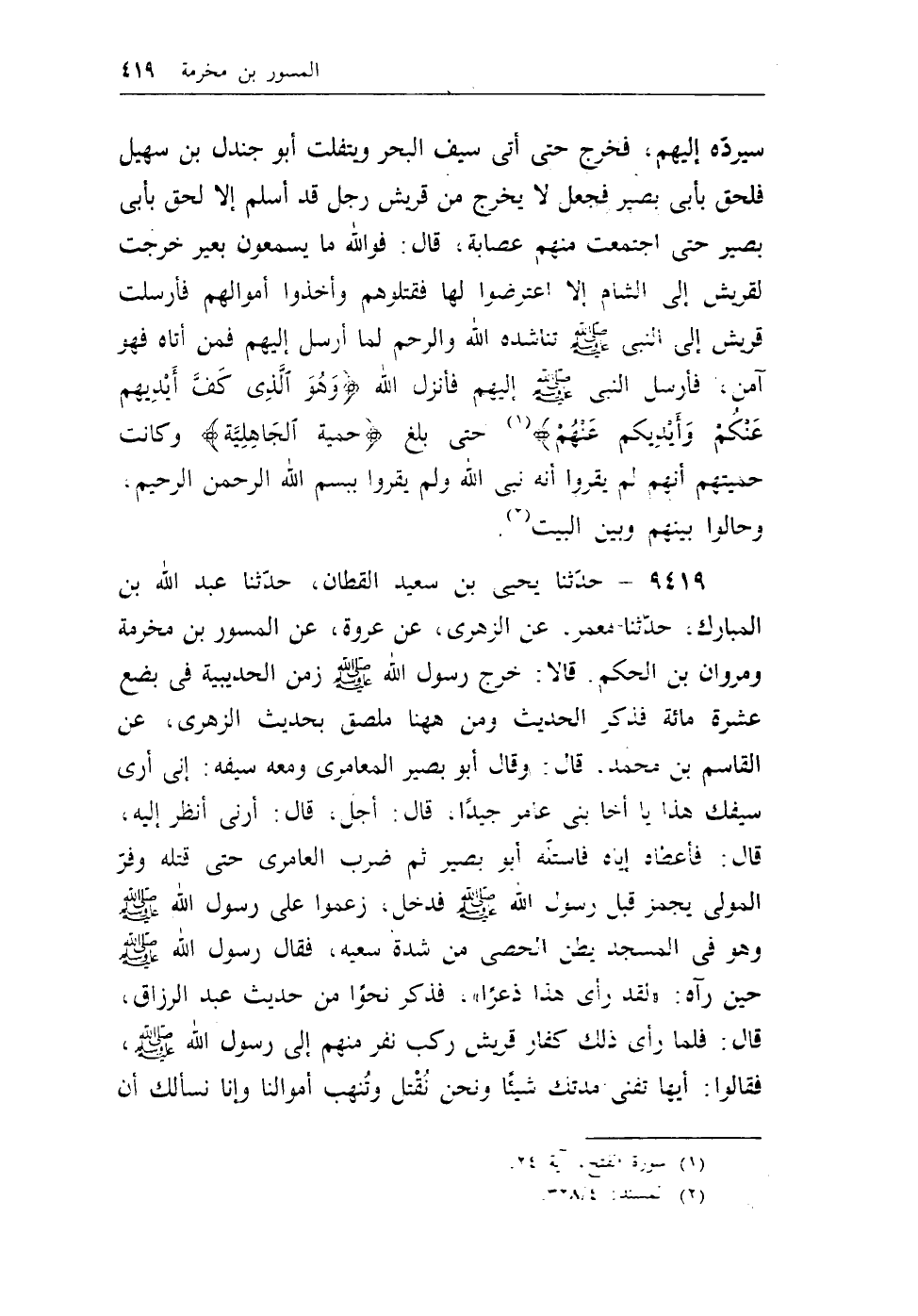 9419 - حدثنا يحيى بن سعيد القطان، حدثنا عبد الله بن المبارك، حدثنا معمر، عن الزهري، عن عروة، عن المسور بن مخرمة ومروان بن الحكم، قالا: خرج رسول الله - صلى الله عليه وسلم - زمن الحديبية في بضع عشرة مائة فذكر الحديث ومن ههنا ملصق بحديث الزهري، عن القاسم بن محمد، قال: وقال أبو بصير المعامري ومعه سيفه: إني أرى سيفك هذا ياأخا بني عامر جيداً، قال: أجل، قال: أرني أنظر إليه، قال: فأعطاه إياه فاستله أبو بصير ثم ضرب العامري حتى قتله وفر المولى يجمز قبل رسول الله - صلى الله عليه وسلم - فدخل، زعموا على رسول الله - صلى الله عليه وسلم - وهو في المسجد يط الحصى من شدة سعيه، فقال رسول الله - صلى الله عليه وسلم - حين رآه: ((لقد رأى هذا ذعراً)) ، فذكر نحواص من حديث عبد الرزاق، قال: فلما رأى ذلك كفار قريش ركب نفر منهم إلى رسول الله - صلى الله عليه وسلم -، فقالوا: أيها تفنى مدتك شيئاً ونحن نُقْتل وتُنهب أموالنا وإنا نسألك أن