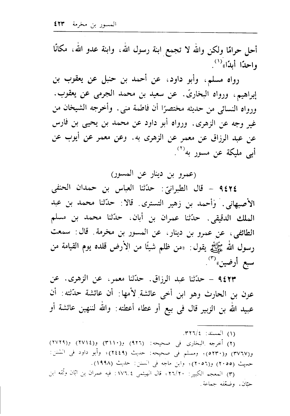 9424 - قال الطبراني: حدثنا العباس بن حمدان الحنفي الأصبهاني، وأحمد بن زهير التستري، قالا: حدثنا محمد بن عبد الملك الدقيقي، حدثنا عمران بن أبان، حدثنا محمد بن مسلم الطائفي، عن عمرو بن دينار، عن المسور بن مخرمة، قال: سمعت رسول الله - صلى الله عليه وسلم - يقول: ((من ظلم شيئاً من الأرض قلده يوم القيامة من سبع أرضين)) (¬1) .