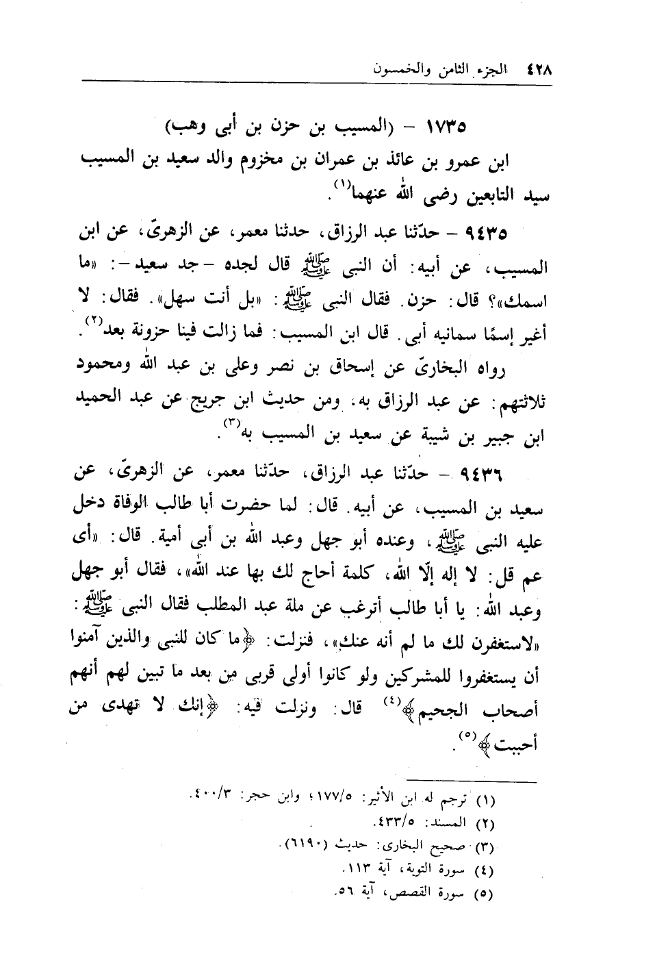 9436 - حدثنا عبد الرزاق، حدثنا معمر، عن الزهري، عن سعيد بن المسيب، عن أبيه، قال: لما حضرت أبا طالب الوفاة دخل عليه النبي - صلى الله عليه وسلم -، وعنده أبو جهل وعبد الله بن أبي أمية، قال: ((أي عم قل: لاإله إلاالله، كلمة أحاج لك بها عند الله)) ، فقال أبو جهل وعبد الله: يا أبا طالب أترغب عن ملة عبد المطلب فقال النبي - صلى الله عليه وسلم -: ((لأستغفرن لك مالم أنه عنك)) ، فنزلت: {مَا كَانَ لِلنَّبِيِّ وَالَّذِينَءَامَنُوا أَنْ يَسْتَغْفِرُوا لِلْمُشْرِكِينَ وَلَوْ كَانُوا أُولِي قُرْبَى مِنْ بَعْدِ مَا تَبَيَّنَ لَهُمْ أَنَّهُمْ أَصْحَابُ الْجَحِيمِ} (¬4) قال: ونزلت فيه: {إِنَّكَ لا تَهْدِي مَنْ أَحْبَبْتَ} (¬5) .