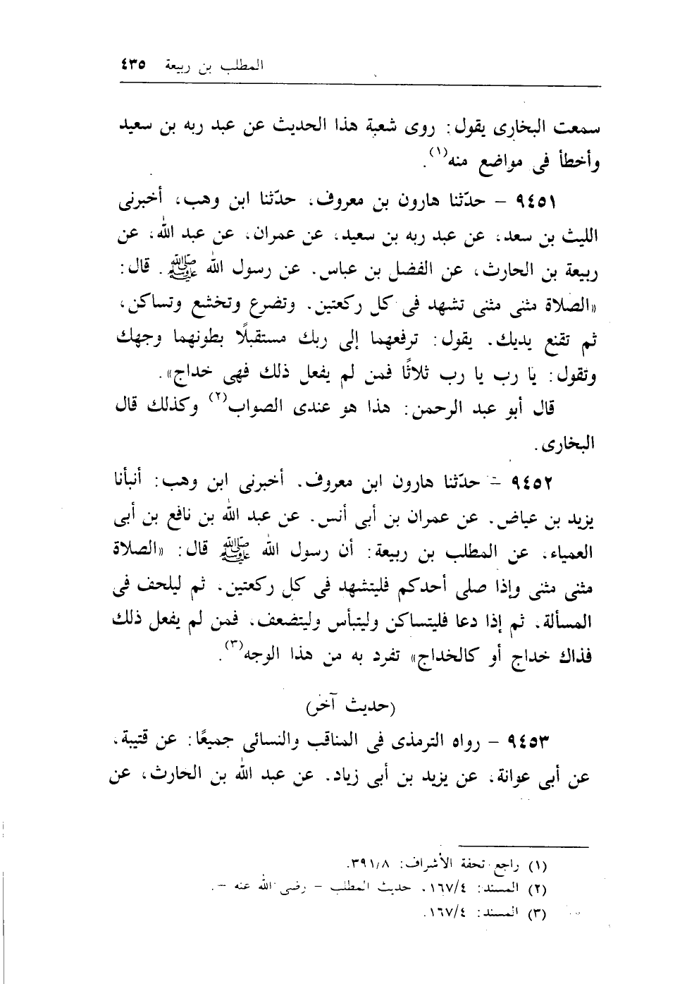 9452 - حدثنا هارون ابن معروف، أخبرني ابن وهب: أنبأنا يزيد بن عياض، عن عمران بن أبي أنس، عن عبد الله بن نافع بن أبي العمياء، عن المطلب بن