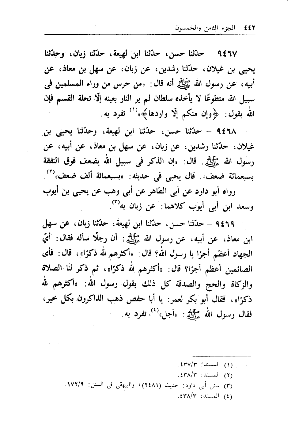 9467 - حدثنا حسن، حدثنا ابن لهيعة، حدثنا زبان، وحدثنا يحيى بن غيلان، حدثنا رشدين، عن زبان، عن سهل بن معاذ، عن أبيه، عن رسول الله - صلى الله عليه وسلم - أنه قال: ((من حرس من وراء المسلمين في سبيل الله متطوعاً لايأخذه سلطان لم ير النار بعينه إلا تحلة القسم فإن الله يقول: {وَإِنْ مِنْكُمْ إِلا وَارِدُهَا} (¬1) . تفرد به.
