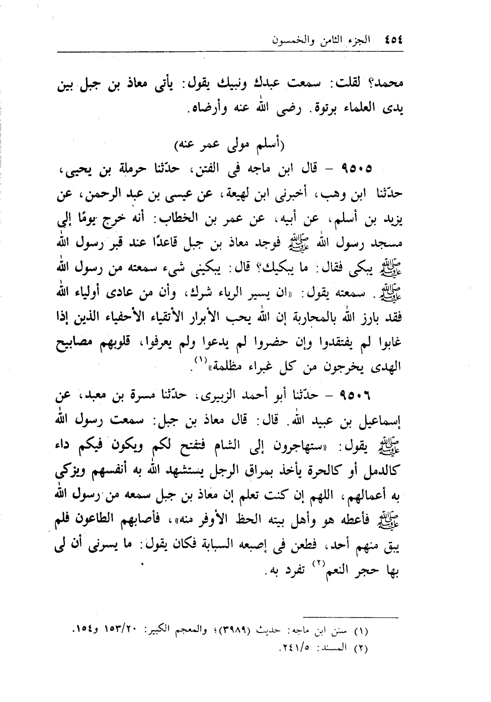 9506 - حدثنا أبو أحمد الزبيري، حدثنا مسرة بن معبد، عن إسماعيل بن عبيد الله. قال: قال معاذ بن جبل: سمعت رسول الله - صلى الله عليه وسلم - يقول: ((ستهاجرون إلى الشام فتفتح لكم ويكون فيكم داء كالدمل أو كالحرة يأخذ بمراق الرجل يستشهد الله به أنفسهم ويزكى به أعمالهم، اللهم إن كنت تعلم إن معاذ بن جبل سمعه من رسول الله - صلى الله عليه وسلم - فأعطه هو وأهل بيته الحظ الأوفر منه)) ، فأصابهم الطاعون فلم يبق منهم أحد، فطعن في إصبعه السبابة فكان يقول: مايسرني أن لي بها حجر النعم (¬2) . تفرد به.