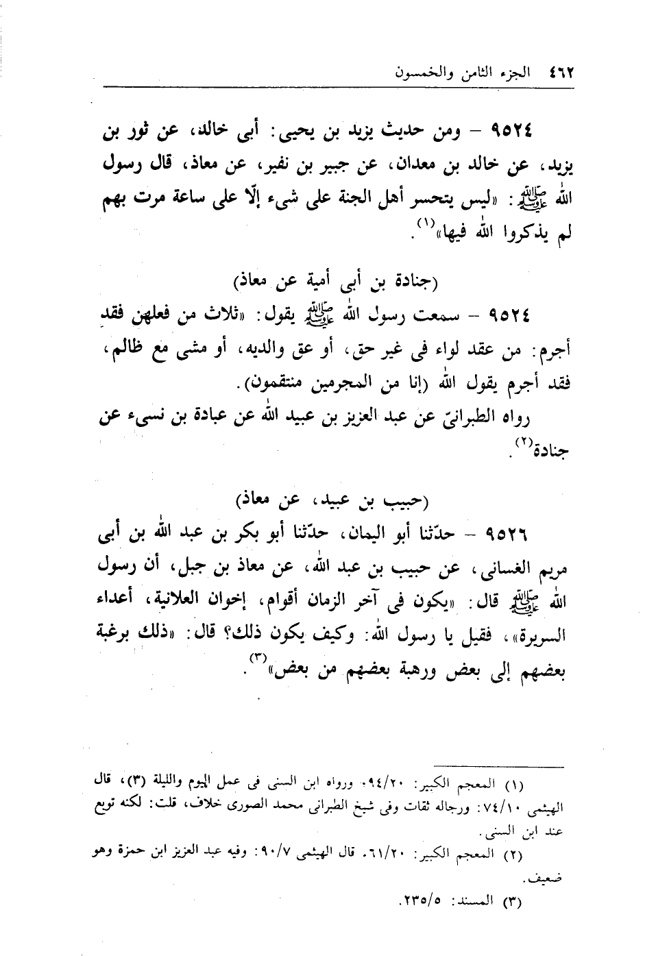 9524 - ومن حديث يزيد بن يحيى: أبي خالد، عن ثور بن يزيد، عن خالد ابن معدان، عن جبير بن نفير، عن معاذ، قال رسول الله - صلى الله عليه وسلم -: ((ليس يتحسر أهل الجنة على شيء إلا على ساعة مرت بهم لم يذكروا الله فيها)) (¬1) .