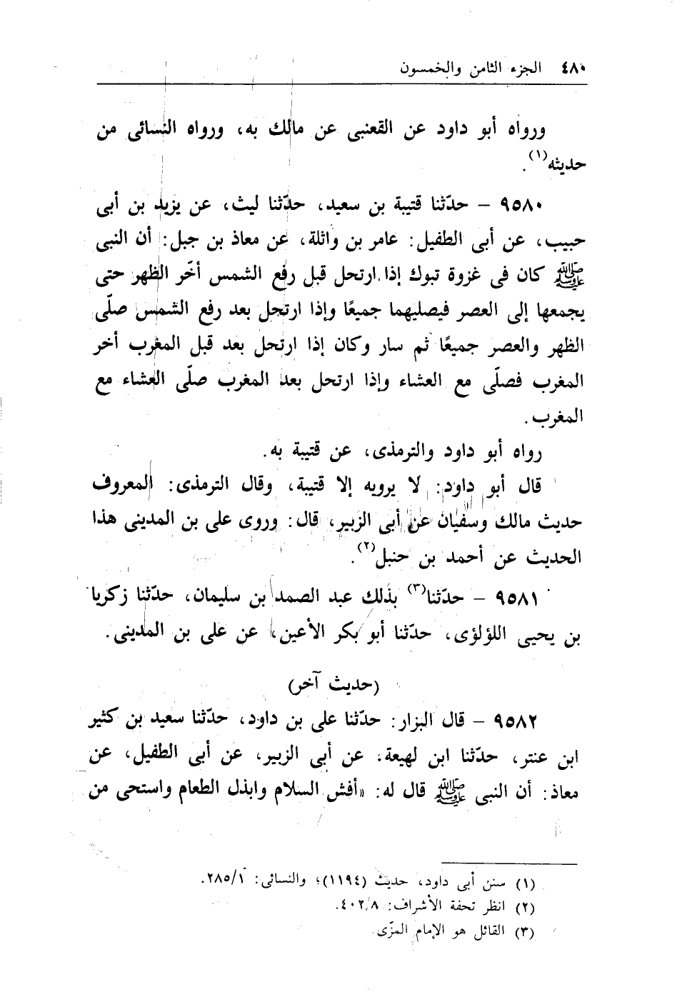 9580 - حدثنا قتيبة بن سعيد، حدثنا ليث، عن يزيد بن أبي حبيب، عن أبي الطفيل: عامر بن واثلة، عن معاذ بن جبل: أن النبي - صلى الله عليه وسلم - كان في غزوة تبوك إذا ارتحل قبل رفع الشمس أخر الظهر حتى يجمعها إلى العصر فيصليهما جميعاً وإذا ارتحل بعد رفع الشمس صلى الظهر والعصر جميعاً ثم سار وكان إذا ارتحل بعد قبل المغرب أخر المغرب فصلى مع العشاء وإذا ارتحل بعد المغرب صلى العشاء مع المغرب.