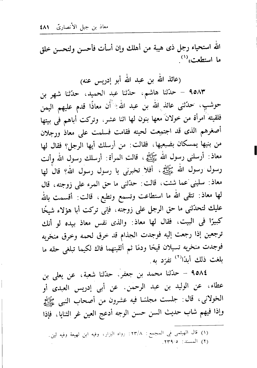9583 - حدثنا هاشم، حدثنا عبد الحميد، حدثنا شهر بن حوشب، حدثني عائذ الله بن عبد الله: أن معاذاً قدم عليهم اليمن فلقيته إمرأة من خولان معها بنون لها اثنا عشر، وتركت أباهم في بيتها أصغرهم الذي قد اجتمعت لحيته فقامت فسلمت على معاذ ورجلان من بنيها يمسكان بضبعيها، فقالت: من أرسلك أيها الرجل؟ فقال لها معاذ: أرسلني رسول الله - صلى الله عليه وسلم -، قالت المرأة: أرسلك رسول الله وأنت رسول الله - صلى الله عليه وسلم -، أفلا تخبرني يارسول رسول الله؟ قال لها معاذ: سليني عما شئت، قالت: حدثني ماحق المرء على زوجته، قال لها معاذ: تتقي الله ما استطاعت وتسمع وتطيع، قالت: أقسمت بالله عليك لتحدثني ماحق الرجل على زوجته، فإني تركت أبا هؤلاء شيخاً كبيراً في البيت، فقال لها معاذ: والذي نفس معاذ بيده لو أنك ترجعين إذا رجعت إليه فوجدت الجذام قد خرق لحمه وخرق منخريه فوجدت منخريه تسيلان قيحاً ودماً ثم ألقيتهما فاك لكيما تبلغي حقه مابلغت ذلك أبداً (¬1) . تفرد به.