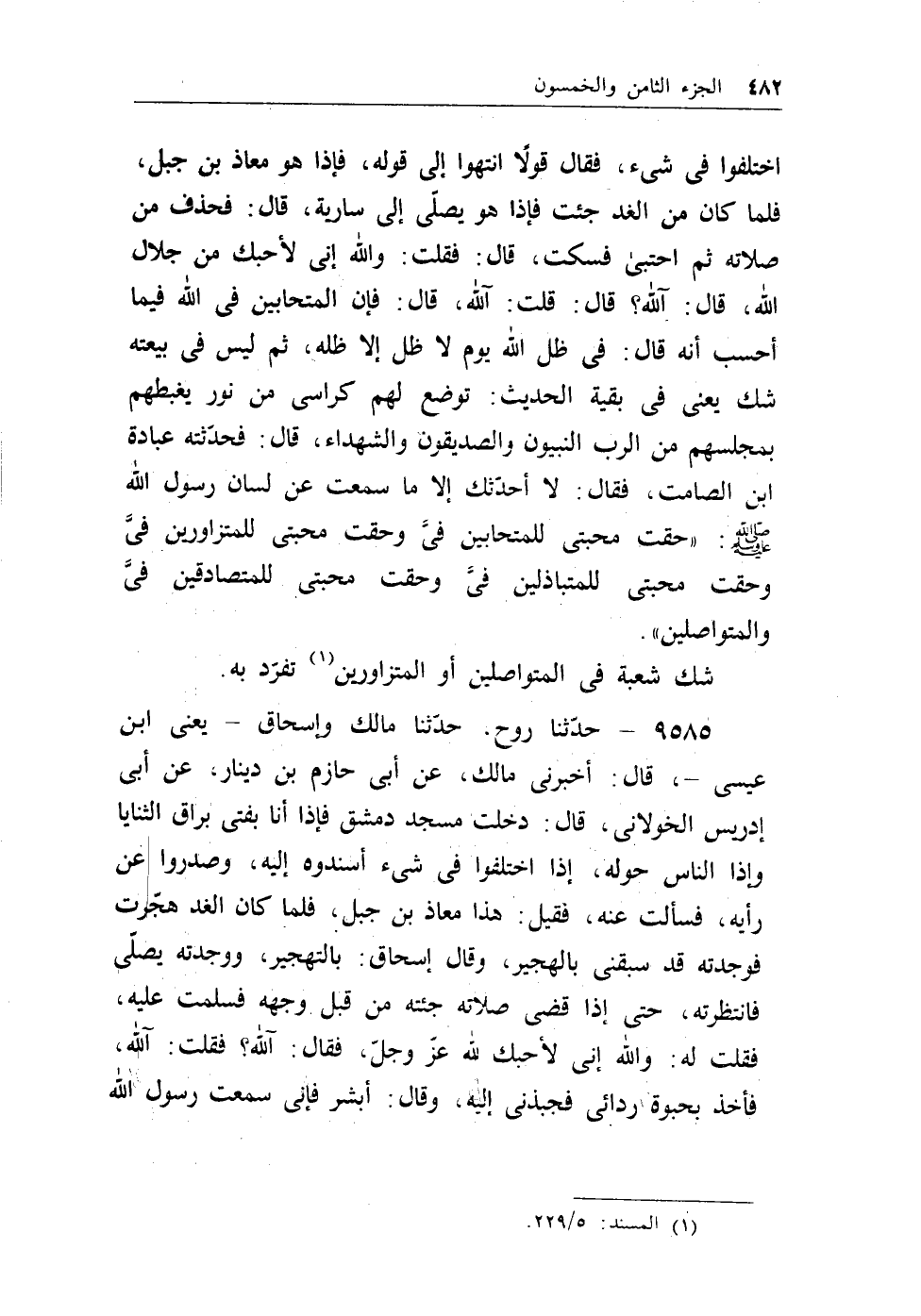 9585 - حدثنا روح، حدثنا مالك وإسحاق -يعني ابن عيسى-، قال: أخبرني مالك، عن أبي حازم بن دينار، عن أبي إدريس الخولاني، قال: دخلت مسجد دمشق فإذا أنا بفتى براق الثنايا وإذا الناس حوله، إذا اختلفوا في شيء أسندوه إليه، وصدروا عن رأيه، فسالت عنه، فقيل: هذا معاذ بن جبل، فلما كان الغد هجرت فوجدته قد سبقني بالهجير، وقال إسحاق: بالتهجير، ووجدته يصلي فانتظرته، حتى إذا قضى صلاته جئته من قبل وجهه فسلمت عليه، فقلت له: والله إني لأحبك لله عز وجل، فقال: آلله؟ فقلت: آلله، فأخذ بحبوة ردائي فجبذني إليه، وقال: أبشر فإني سمعت رسول الله