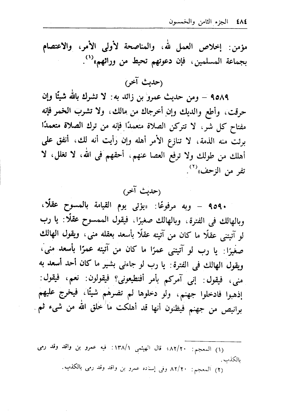 (¬1) المعجم، 20/82؛ قال الهيثمي، 1/138: فيه عمرو بن واقد وقد رمى بالكذب.