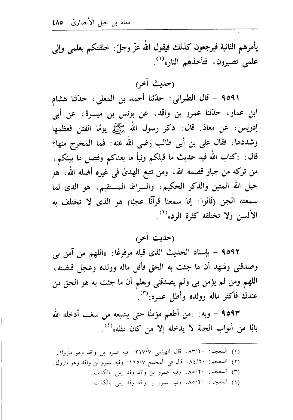 9591 - قال الطبراني: حدثنا أحمد بن المعلى، حدثنا هشام بن عمار، حدثنا عمرو بن واقد، عن يونس بن ميسرة، عن أبي إدريس، عن معاذ. قال: ذكر رسول الله - صلى الله عليه وسلم - يوماً الفتن فعظمها وشددها، فقال علي بن أبي طالب رضي الله عنه: فما المخرج منها؟ قال: ((كتاب الله فيه حديث ماقبلكم ونبأ مابعدكم وفصل مابينكم، من تركه من جبار قصمه الله، ومن تتبع الهدى في غيره أضله الله، هو حبل الله المتين والذكر الحكيم، والصراط المستقيم، هو الذي لما سمعته الجن) قالوا: إنا سمعنا قرآناً عجباً) هو الذي لاتختلف به الألسن ولاتختلقه كثرة الرد)) (¬1) .