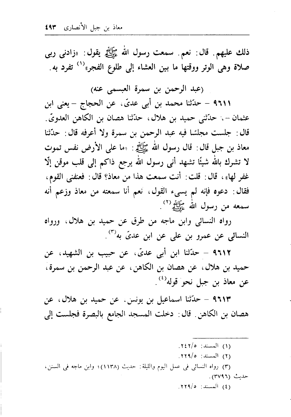 9612 - حدثنا ابن أبي عدي، عن حبيب بن الشهيد، عن حميد بن هلال، عن هصان بن الكاهن، عن عبد الرحمن بن سمرة، عن معاذ بن جبل نحو قوله (¬3) .