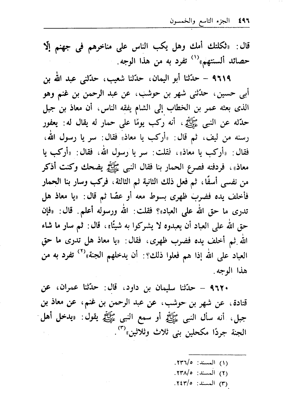 9619 - حدثنا أبو اليمان، حدثنا شعيب، حدثني عبد الله بن أبي حسين، حدثني شهر بن حوشب، عن عبد الرحمن بن غنم وهو الذي بعثه عمر بن الخطاب إلى الشام يفقه الناس، أن معاذ بن جبل حدثه عن النبي - صلى الله عليه وسلم -، أنه ركب يوماً على حمار له يقال له: يعفور رسنه من ليف، ثم قال: ((أركب يامعاذ)) فقال: سر يارسول الله، فقال: ((أركب يامعاذ)) ، فقلت: سر يارسول الله، فقال: ((أركب يامعاذ)) ، فردفته فصرع الحمار بنا فقال النبي - صلى الله عليه وسلم - يضحك وكنت أذكر من نفسي أسفاً، ثم فعل ذلك الثانية ثم الثالثة، فركب وسار بنا الحمار فأخلف يده فضرب ظهري بسوط معه أو عصاً ثم قال: ((يامعاذ هل تدري ماحق الله على العباد؟)) فقلت: الله ورسوله أعلم. قال: ((فإن حق الله على العباد أن يعبدوه لايشركوا به شيئاً)) ، قال: ثم سار ماشاء الله. ثم أخلف يده فضرب ظهري، فقال: ((يامعاذ هل تدري ماحق العباد على الله إذا هم فعلوا ذلك؟: أن يدخلهم الجنة)) (¬1) . تفرد به من هذا الوجه.