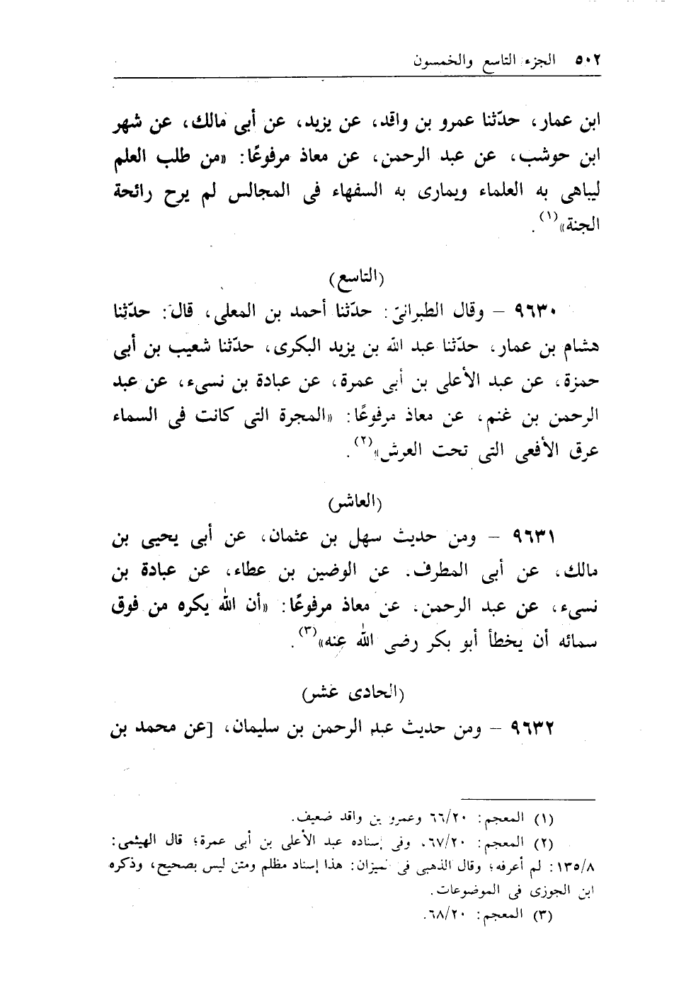 9631 - ومن حديث سهل بن عثمان، عن أبي يحيى بن مالك، عن أبي المطرف، عن الوضين بن عطاء، عن عبادة بن نسئ، عن عبد الرحمن، عن معاذ مرفوعاً: ((أن الله يكره من فوق سمائه أن يخطأ أبو بكر رضي الله عنه)) (¬2) .