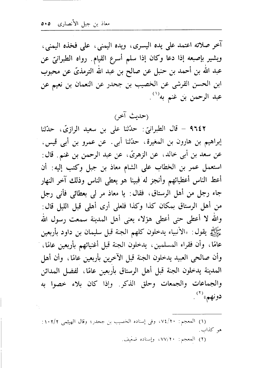 9642 - قال الطبراني: حدثنا علي بن سعيد الرازي، حدثنا إبراهيم بن هارون ابن المغيرة، حدثنا أبي، عن عمرو بن أبي قيس، عن سعد بن أبي خالد، عن الزهري، عن عبد الرحمن بن غنم، قال: استعمل عمر بن الخطاب على الشام معاذ ابن جبل وكتب إليه: أن أعط الناس أعطيائهم وأنجز له فبينا هو يعطي الناس وذلك آخر النهار جاء رجل من أهل الرستاق، فقال: يامعاذ مر لي بعطائي فإني رجل من أهل الرستاق بمكان كذا وكذا فلعلي أرى أهلي قبل اليل قال: والله لا أعطي حتى أعطي هؤلاء يعني أهل المدينة سمعت رسول الله - صلى الله عليه وسلم - يقول: ((الأنبياء يدخلون