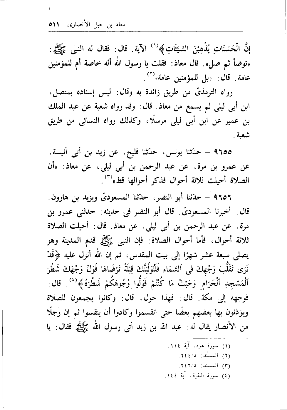 9656 - حدثنا أبو النضر، حدثنا المسعودي ويزيد بن هارون، قال: أخبرنا المسعودي، قال أبو النضر في حديثه: حدثني عمرو بن مرة، عن عبد الرحمن بن أبي ليلى، عن معاذ. قال: أحيلت الصلاة ثلاثة أحوال، فأما أحوال الصلاة: فإن النبي - صلى الله عليه وسلم - قدم المدينة وهو يصلى سبعة عشر شهراً إلى بيت المقدس، ثم إن الله أنزل عليه {قَدْ نَرَى تَقَلُّبَ وَجْهِكَ فِي السَّمَاءِ فَلَنُوَلِّيَنَّكَ قِبْلَةً تَرْضَاهَا فَوَلِّ وَجْهَكَ شَطْرَ الْمَسْجِدِ الْحَرَامِ وَحَيْثُ مَا كُنْتُمْ فَوَلُّوا وُجُوهَكُمْ شَطْرَهُ} (¬2) . قال فوجهه إلى مكة، قال: فهذا حول، قال: وكانوا يجمعون للصلاة ويؤذنون بها بعضهم بعضاً حتى انقسموا وكادوا أن ينقسموا ثم إن رجلاً من الأنصار يقال له: عبد الله بن زيد أتي رسول الله - صلى الله عليه وسلم - فقال: يا